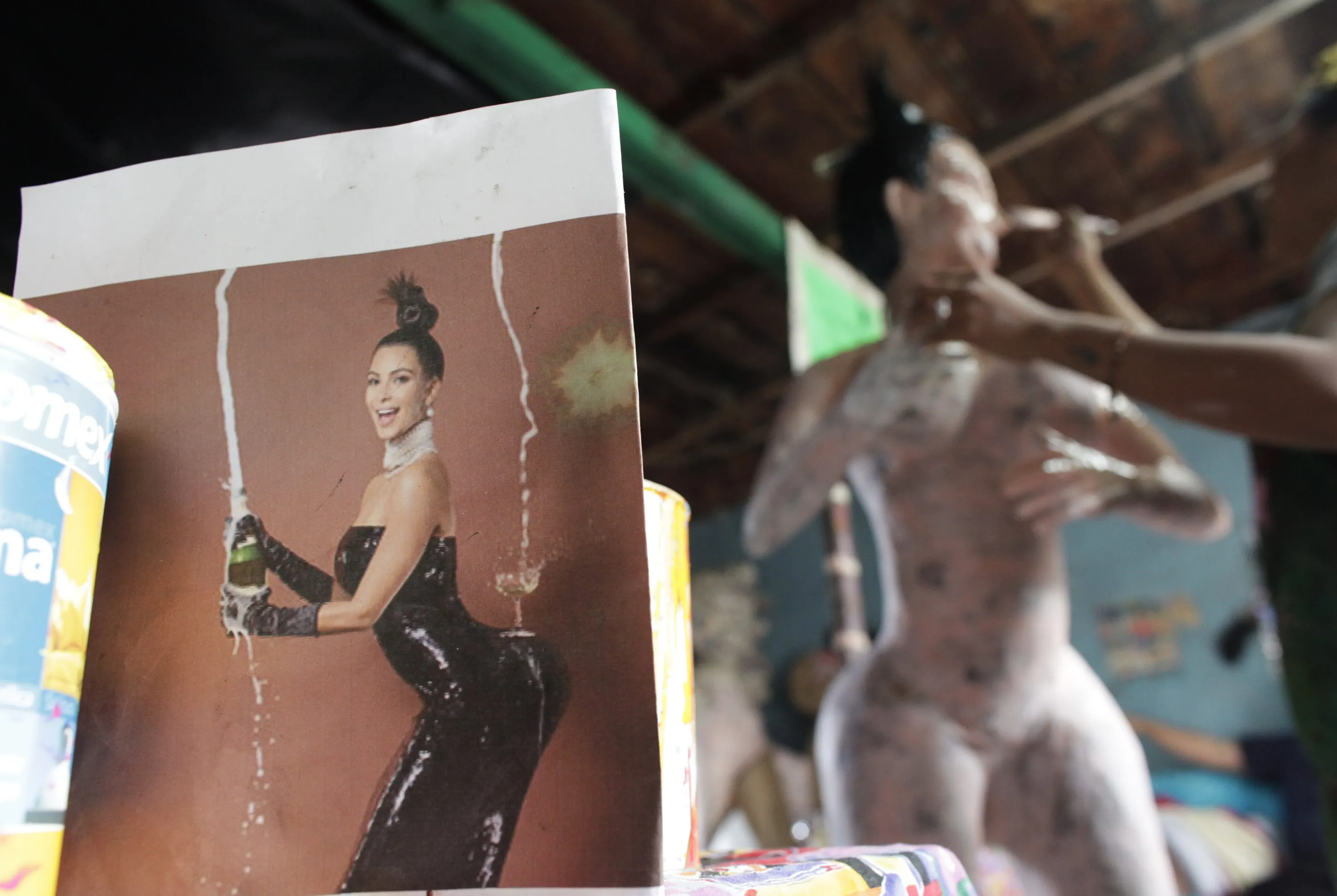 A photograph of TV celebrity Kim Kardashian stands in between two pots of paint, as Adriana Ramirez (partially obscured) paints a pinata depicting Kardashian at her brother's workshop in Reynosa December 6, 2014. (Photo by Daniel Becerril/Reuters)