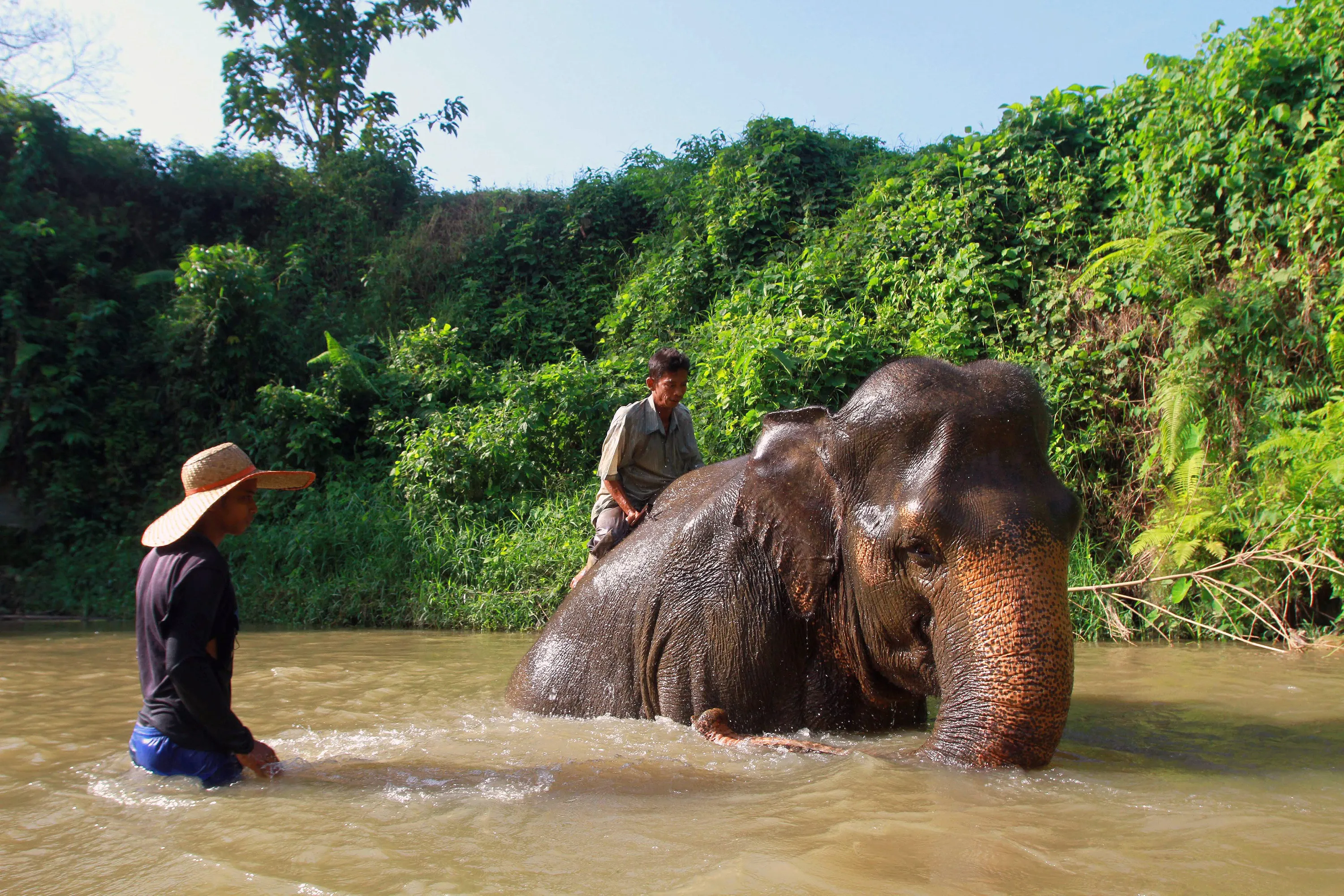 Indonesian mahouts clean their Sumatran elephant in a river near the zoo in Medan, North Sumatra, Indonesia, 12 December 2014. According media reports, the smallest of the Asian elephants, Sumatran elephant (Elephas maximus sumatrensis) is facing serious pressures arising from illegal logging and associated habitat loss and fragmentation in Indonesia. The population has come under increasing threat from rapid forest conversion to plantations. (Photo by Dedi Sahputra/EPA)