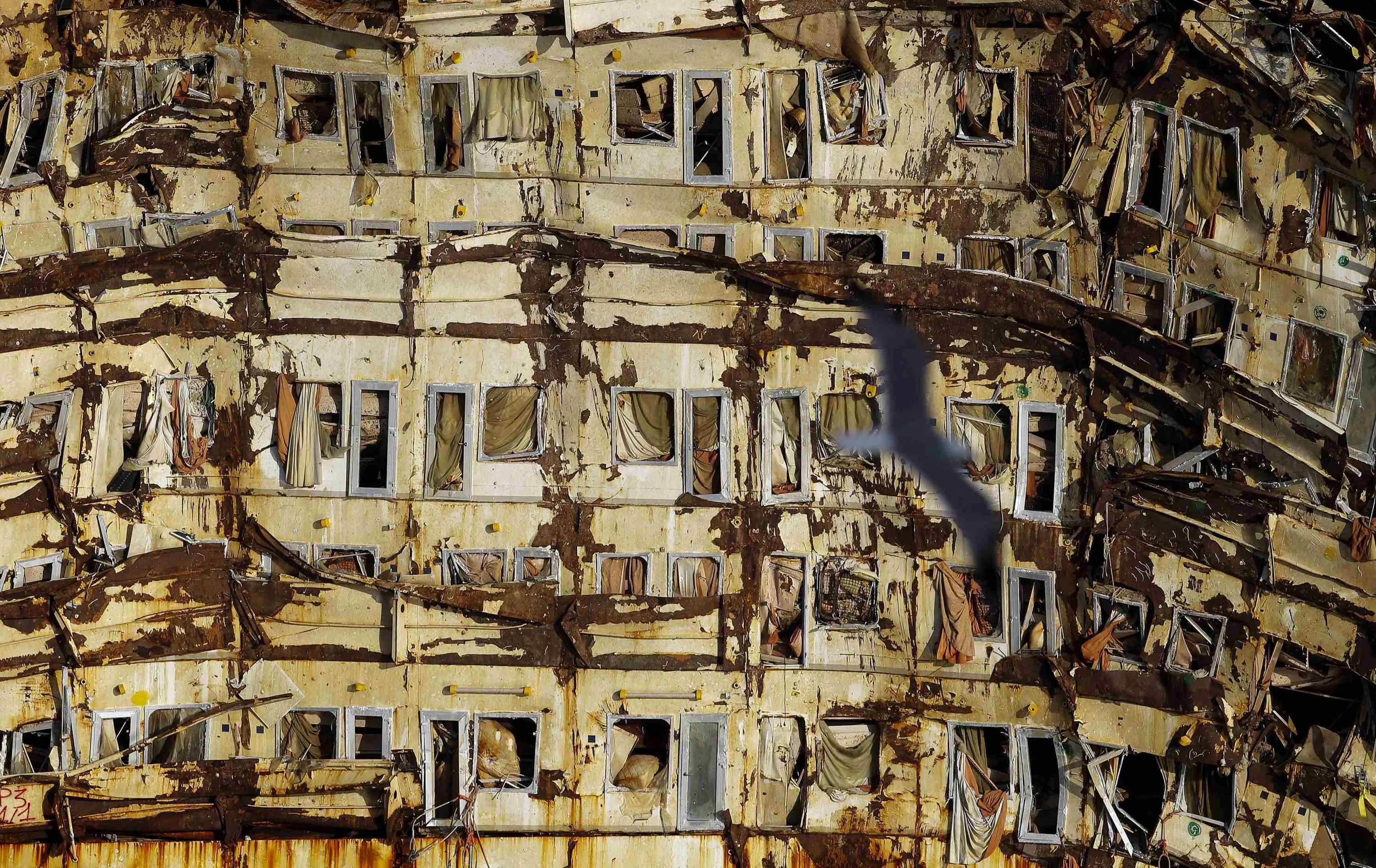 A seagull flies past the side of the cruise liner Costa Concordia during the “parbuckling” operation outside Giglio harbour, in this January 12, 2014 file photo. (Photo by Max Rossi/Reuters)