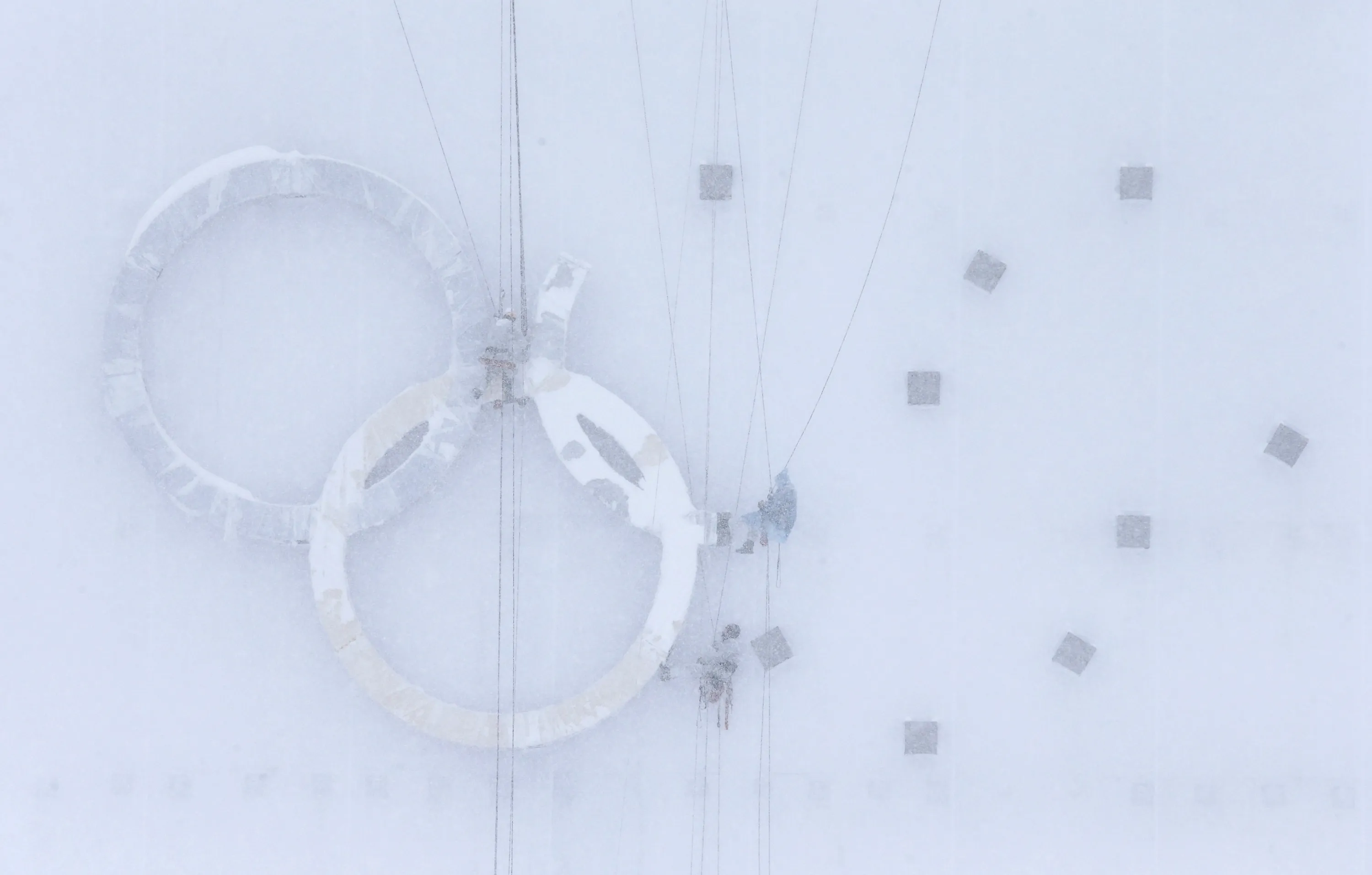 People work on the Olympic rings during heavy snow at the Laura Cross-country Ski and Biathlon Centre in Krasnaya Polyana near Sochi, in this January 24, 2014 file photo. (Photo by Alexander Demianchuk/Reuters)