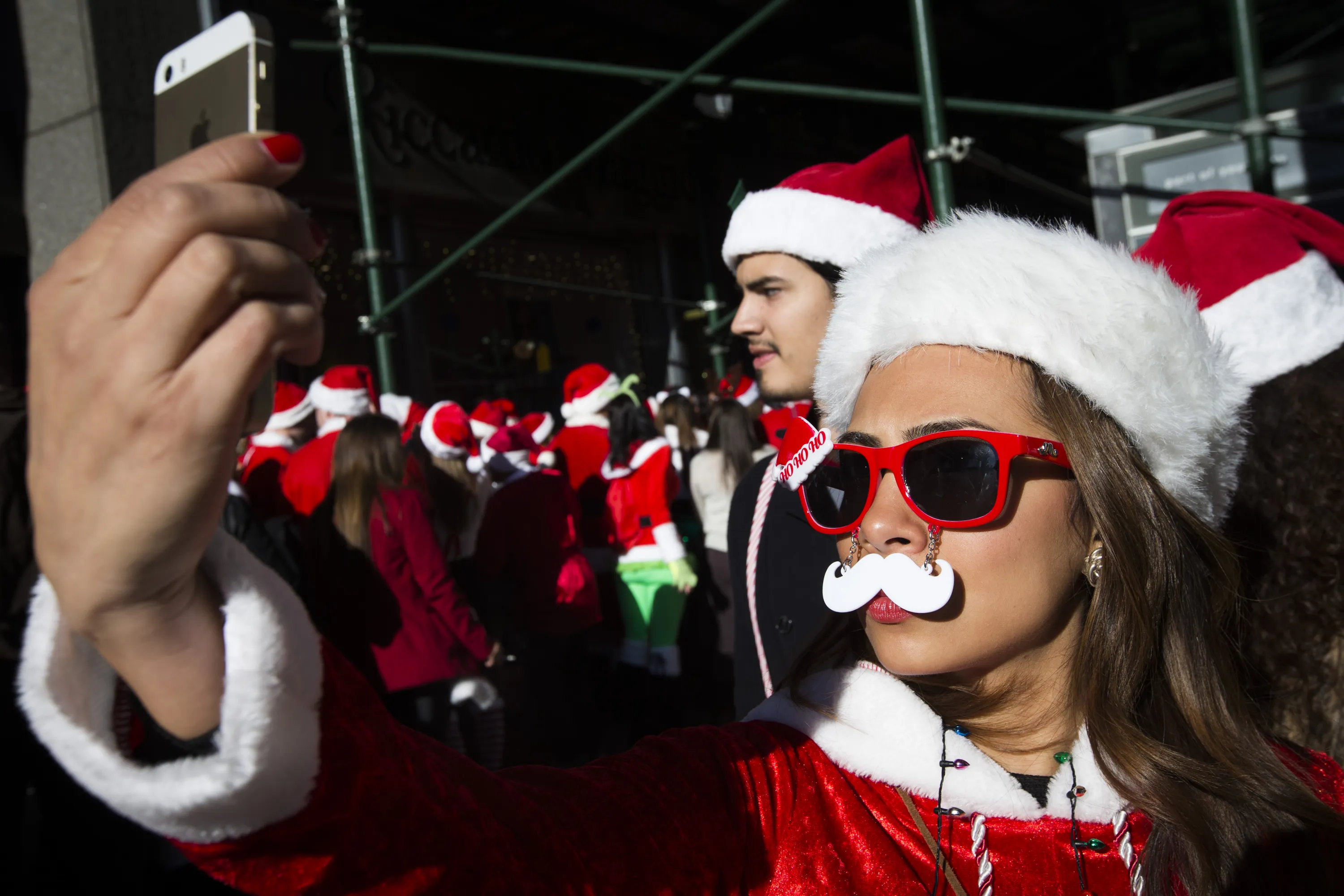 A reveler dressed in a holiday theme costume takes a selfie during SantaCon, Saturday, December 13, 2014, in New York. (Photo by John Minchillo/AP Photo)