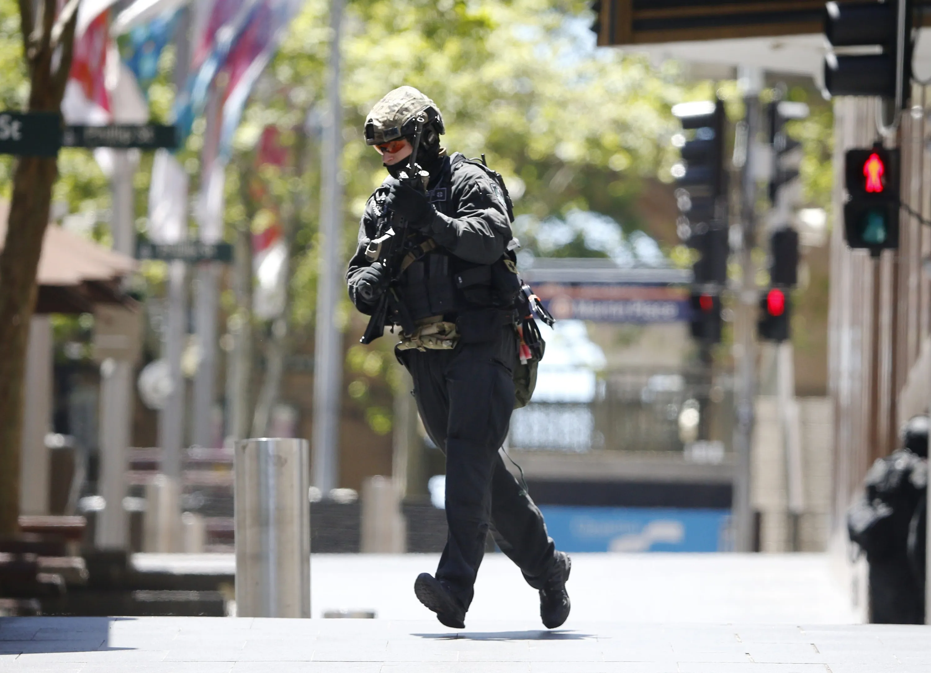A police officer runs across Martin Place near Lindt Cafe where hostages are being held, in central Sydney December 15, 2014. (Photo by Jason Reed/Reuters)