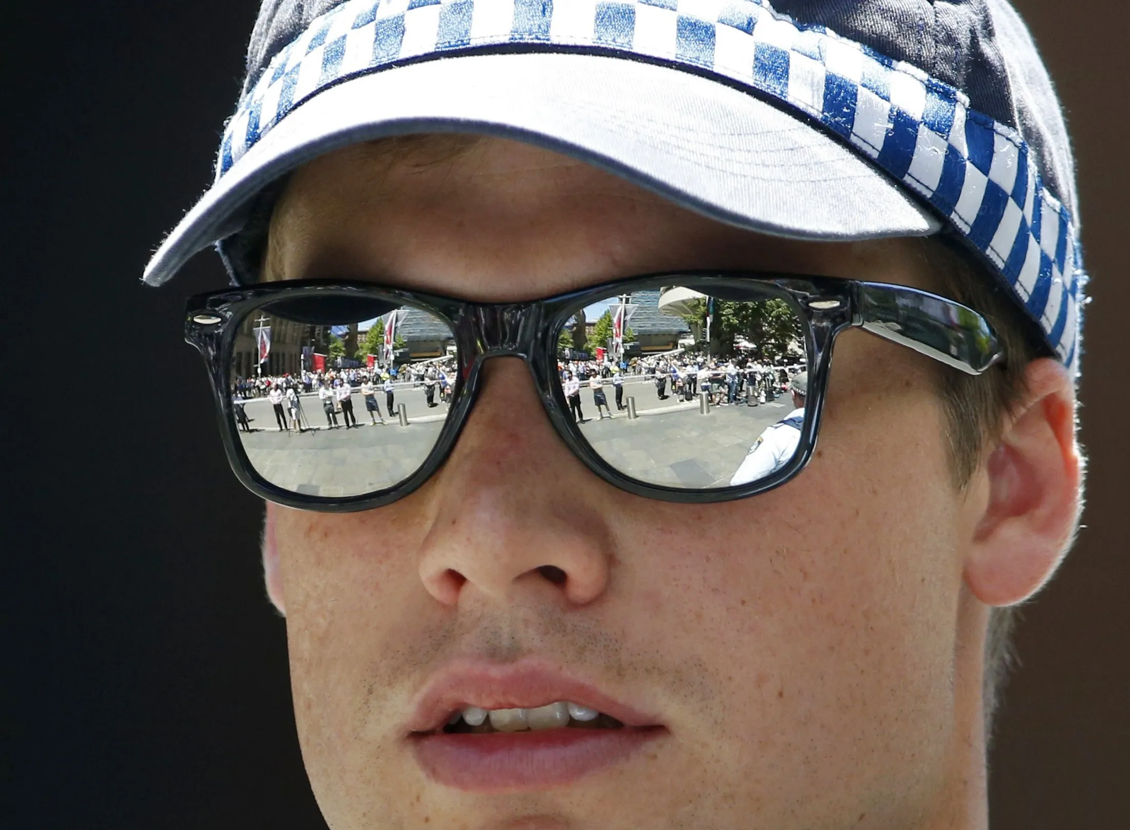 Reporters and other onlookers behind a police cordon are reflected in the glasses of a police officer near Lindt cafe in Martin Place, where hostages are being held, in central Sydney December 15, 2014. (Photo by Jason Reed/Reuters)
