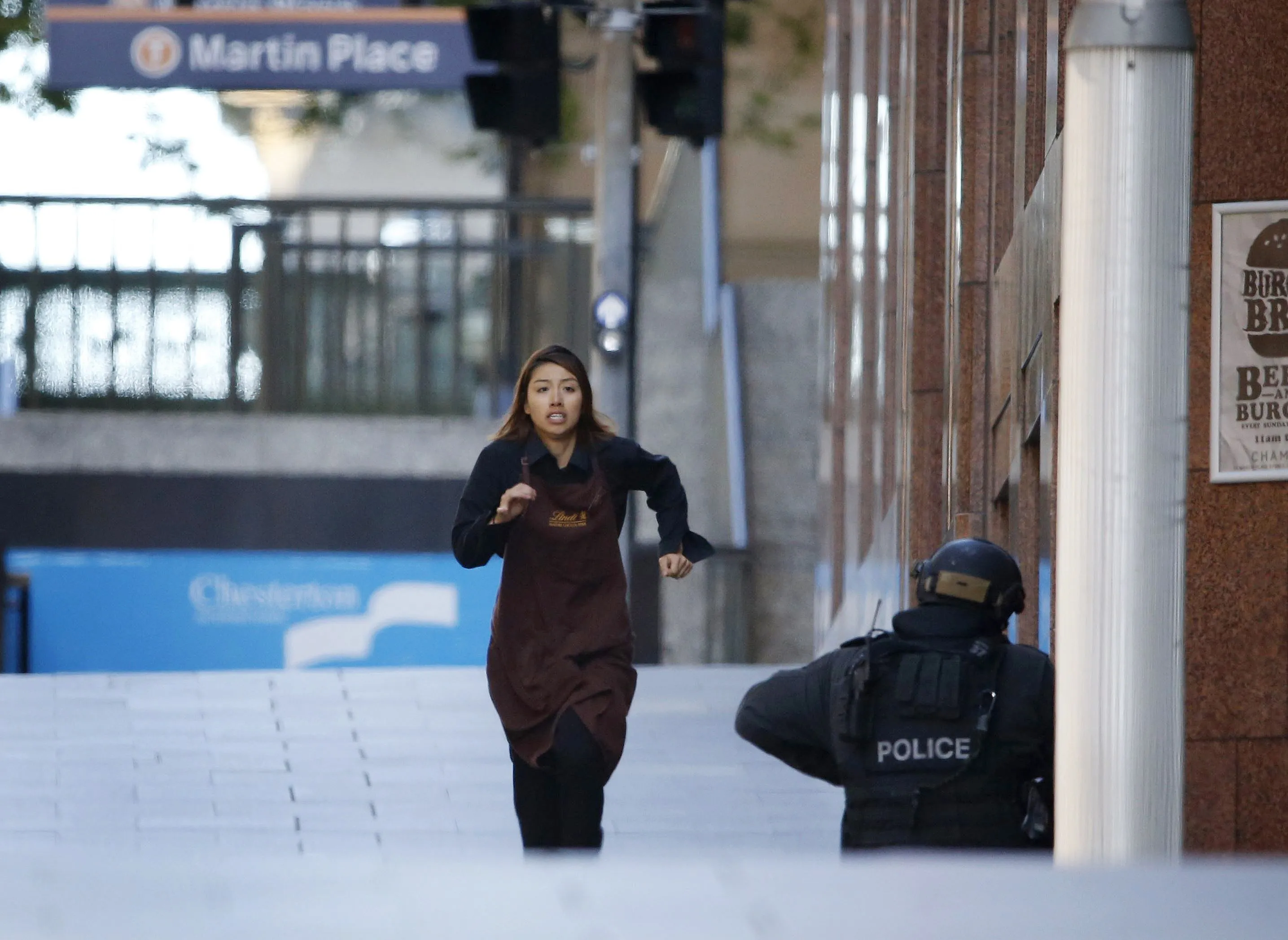 A hostage runs towards a police officer outside Lindt cafe, where other hostages are being held, in Martin Place in central Sydney December 15, 2014. (Photo by Jason Reed/Reuters)