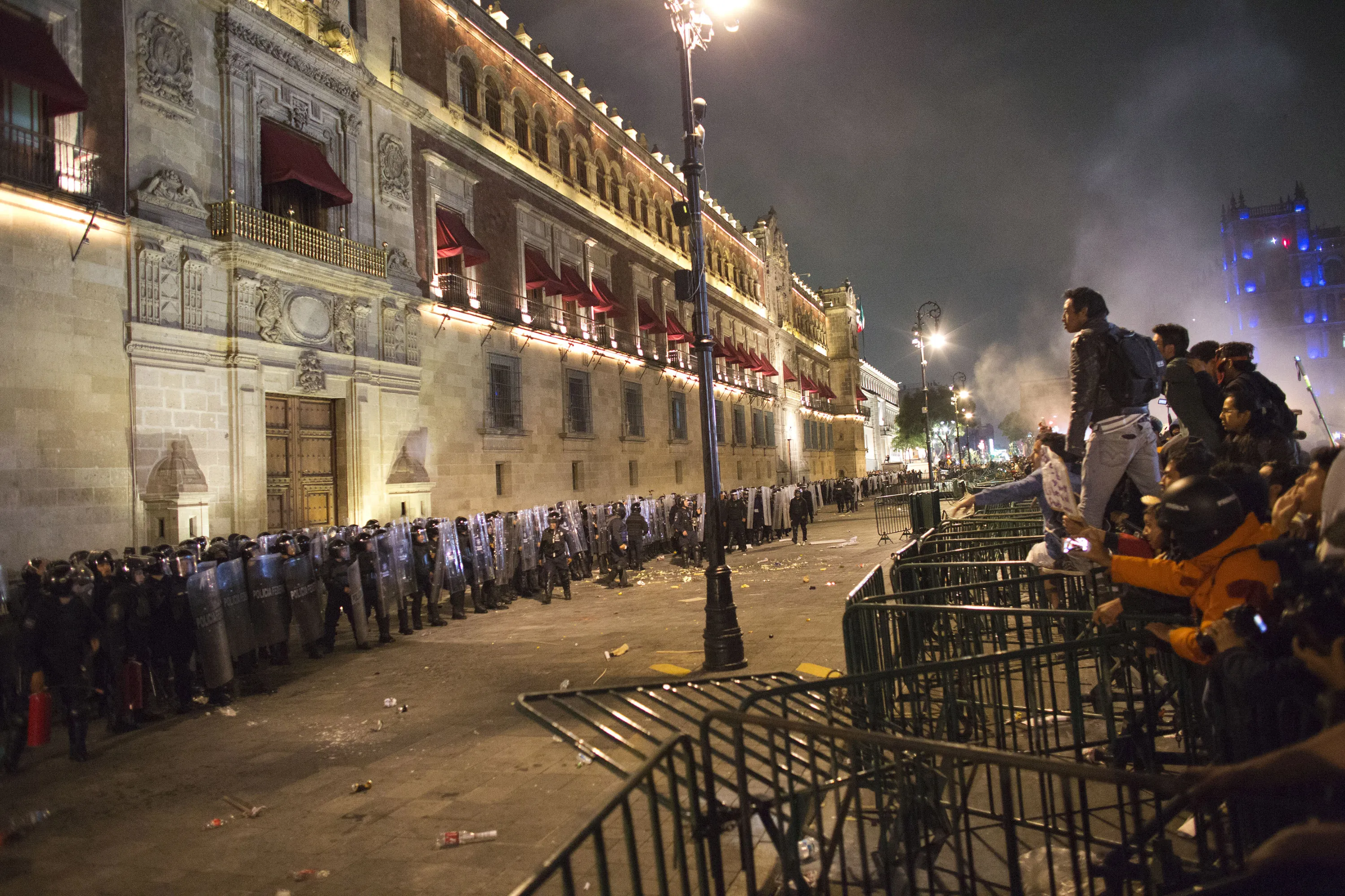 In this November 20, 2014 file photo, protestors face off against federal police over barriers surrounding the National Palace in Mexico City. Protesters marched in the capital city to demand authorities find 43 missing college students, seeking to pressure the government. Mexico officially lists more than 20,000 people as having gone missing since the start of the country's drug war in 2006, and the search for the missing students has turned up other, unrelated mass graves. (Photo by Rebecca Blackwell/AP Photo)