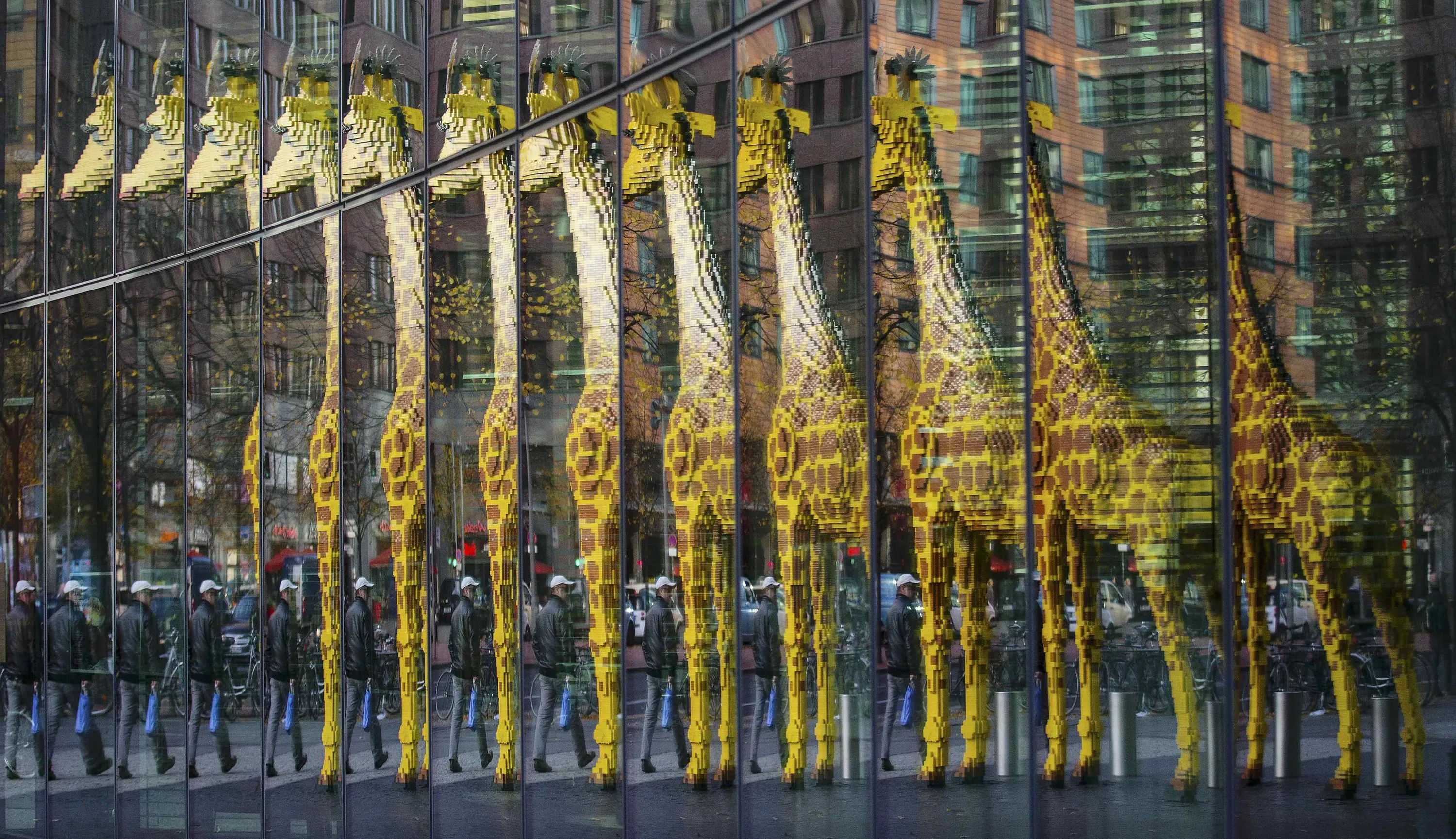 A giraffe made of Lego bricks is reflected in a glass front of a house in Berlin November 7, 2014. (Photo by Hannibal Hanschke/Reuters)
