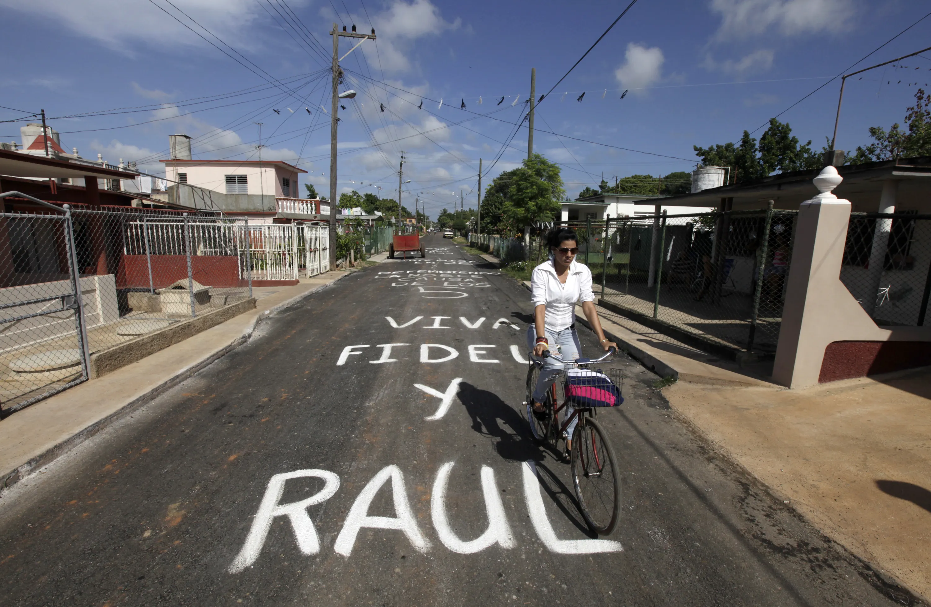A woman rides her bicycle on a road that reads “Long live Fidel and Raul” in Artemisa province, near Havana July 25, 2014. (Photo by Enrique de la Osa/Reuters)