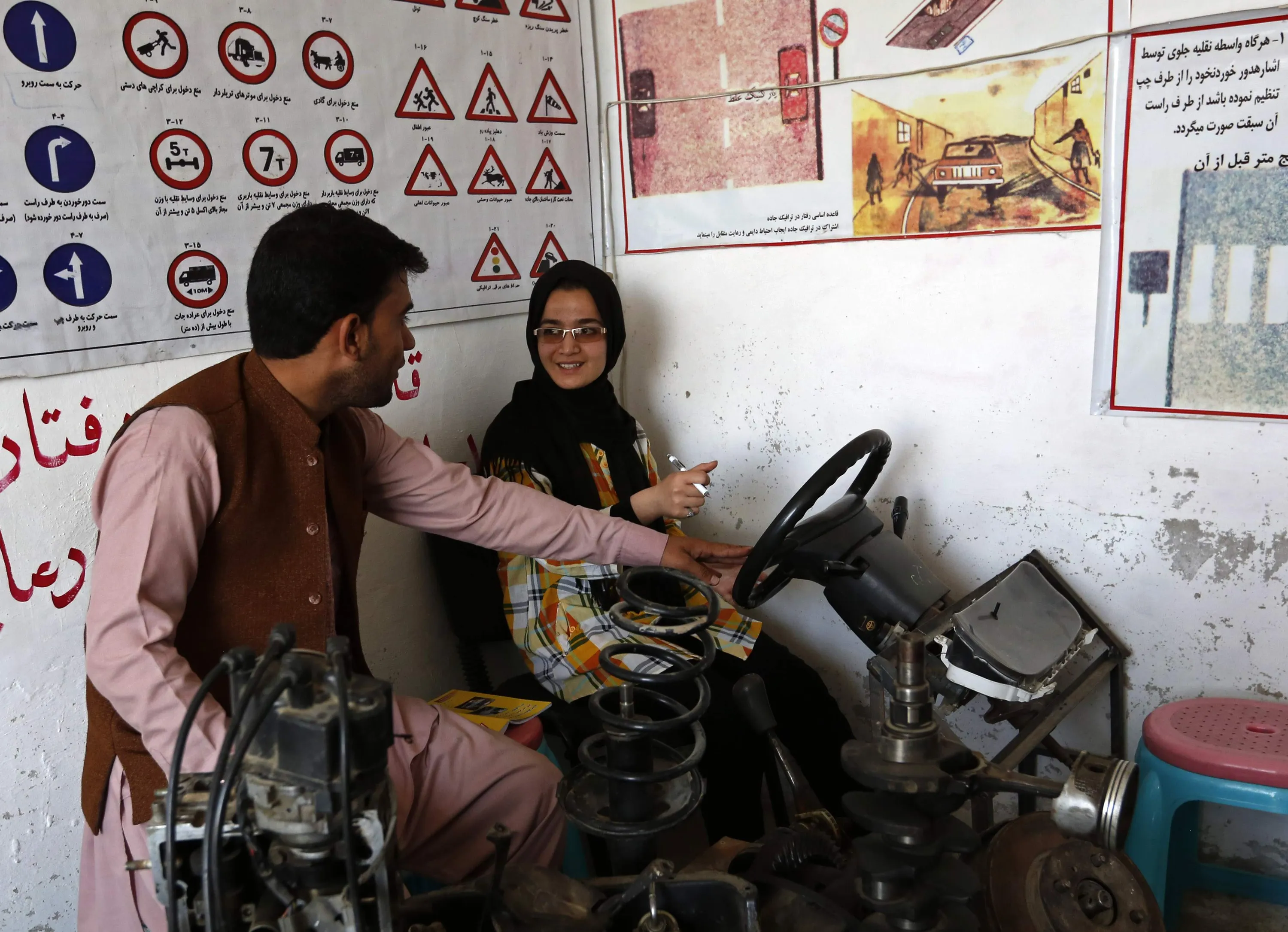 Tahmina, (R) talks to her instructor during a practical lesson at a driving school in Kabul September 4, 2014. (Photo by Mohammad Ismail/Reuters)