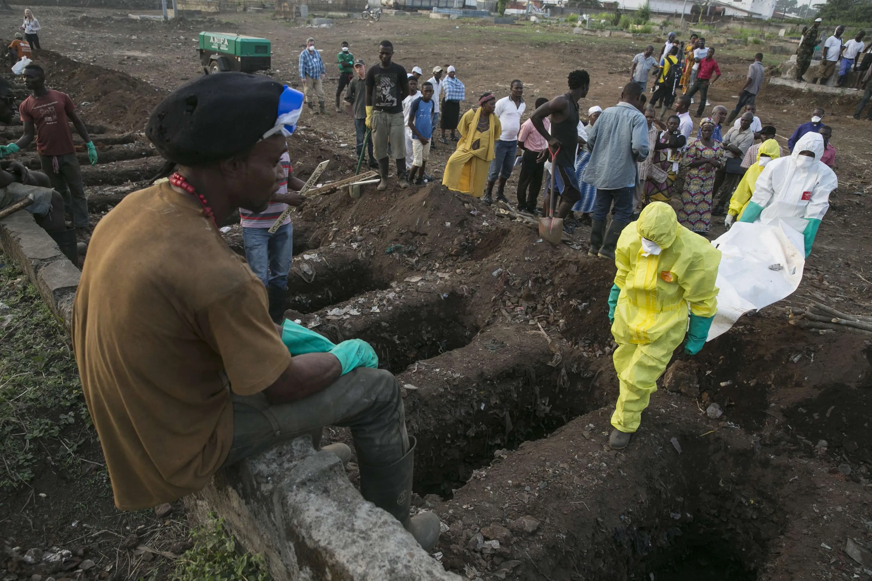 A grave digger watches as health workers carry the body of an Ebola victim for burial at a cemetery in Freetown, Sierra Leone, December 17, 2014. (Photo by Baz Ratner/Reuters)