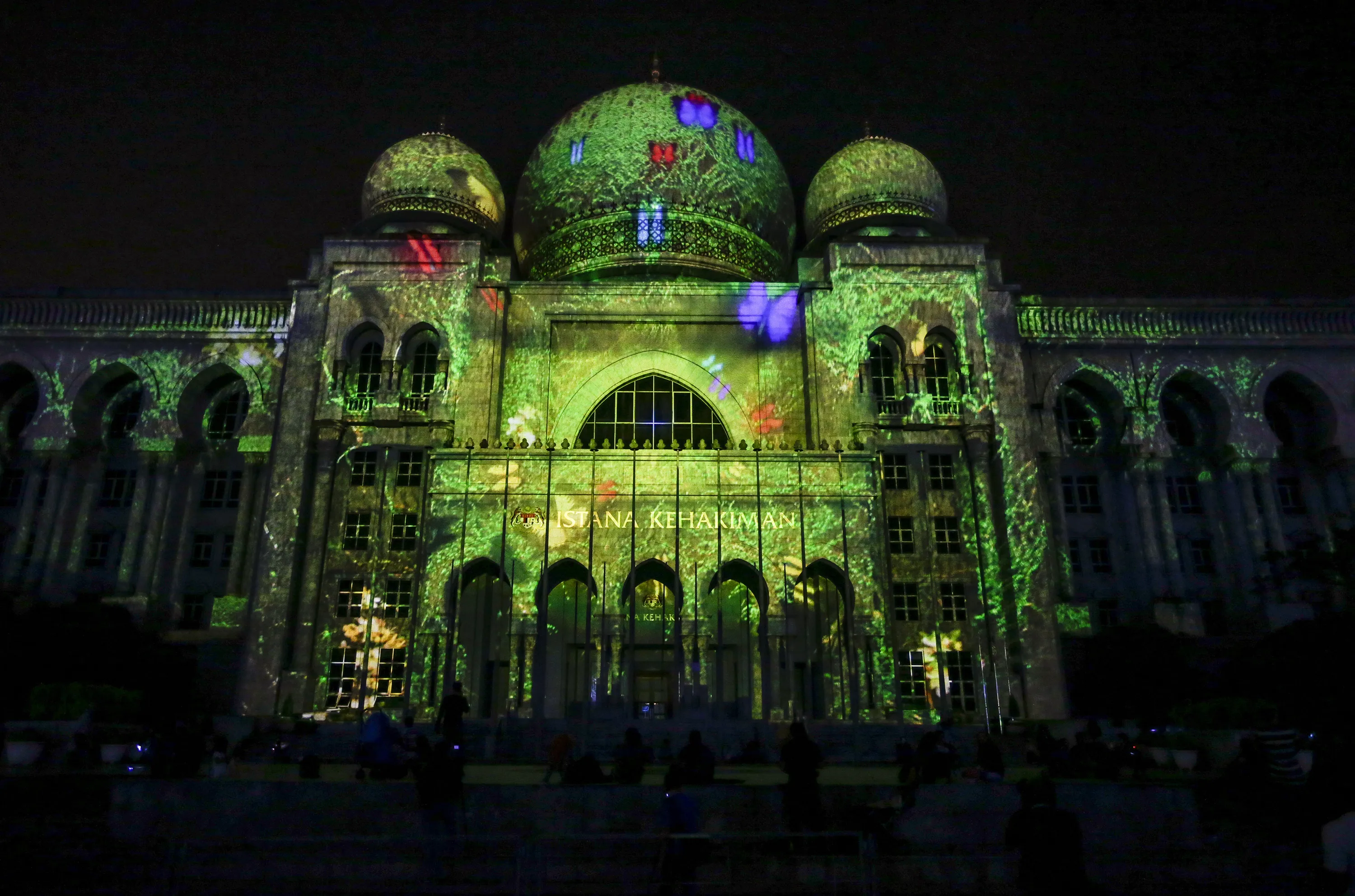 The Malaysia administration office building, Palace of Justice, is illuminated with lighting and graphic during the Putrajaya Lighting and Motion Festival 2014, in Putrajaya, outside Kuala Lumpur, Malaysia, December 13, 2014. The festival was held from December 12 to 13. (Photo by Azhar Rahim/EPA)