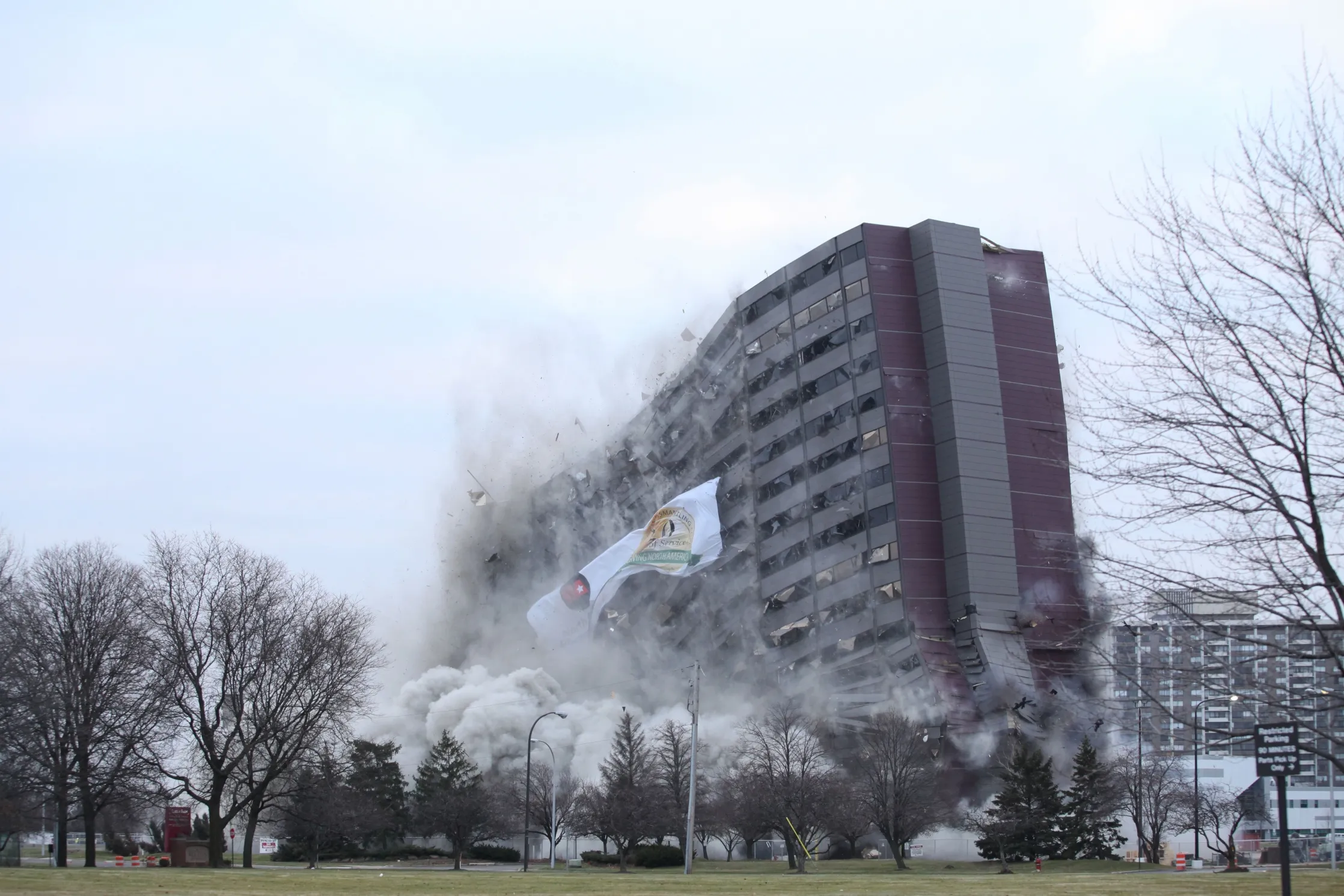 The North Park Plaza building is imploded on Sunday, December 14, 2014 in Southfield, Mich. Oakland Community College owns the property just north of Detroit and auctioned off the chance to blow it up to the highest bidder. The college bought the 42-year-old building earlier this year and says it has no immediate plans for the land. (Photo by Tim Galloway/AP Photo/Detroit Free Press)