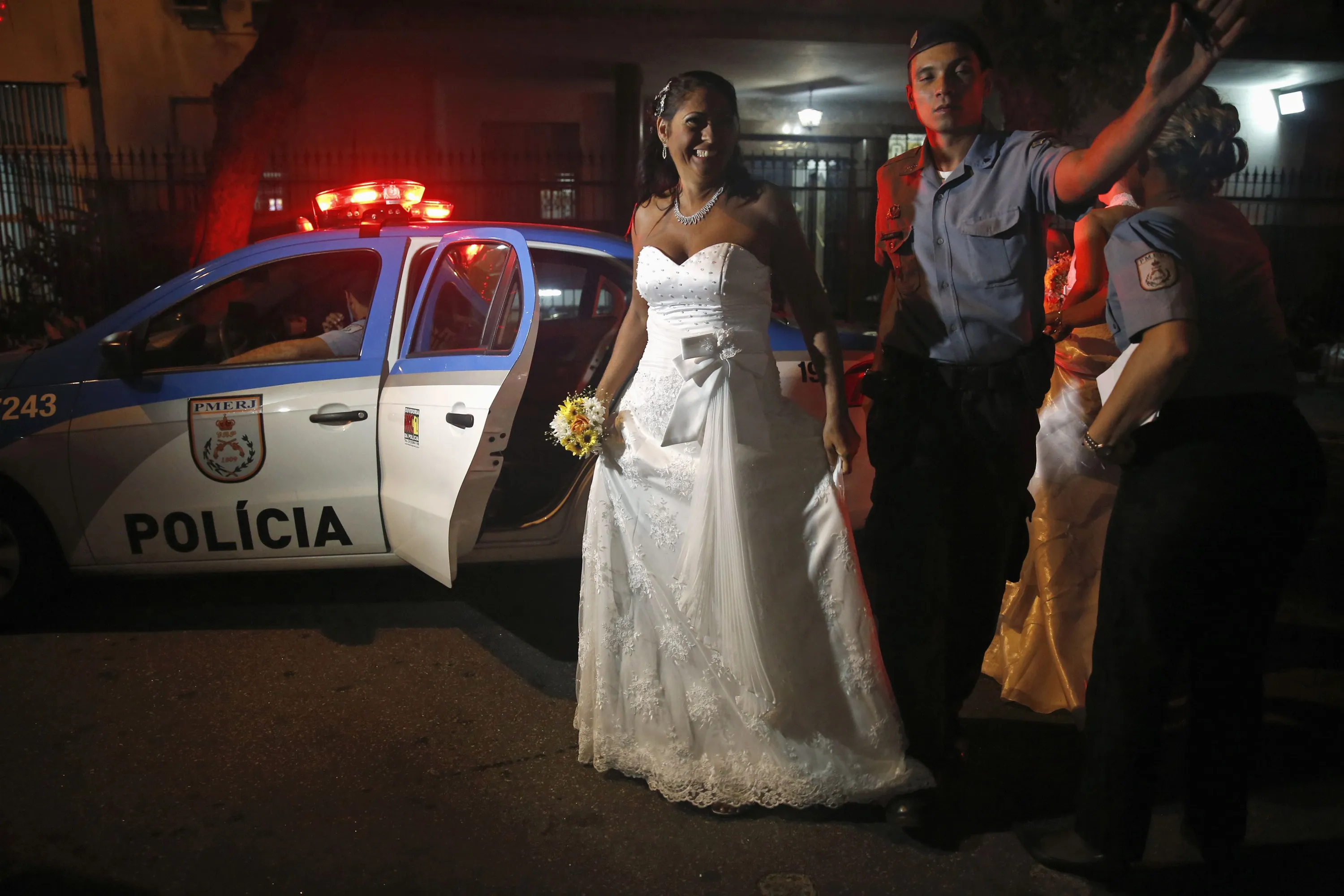 A bride from the Santa Marta slum is escorted by a police officer to her group wedding in Rio de Janeiro December 17, 2014. (Photo by Pilar Olivares/Reuters)