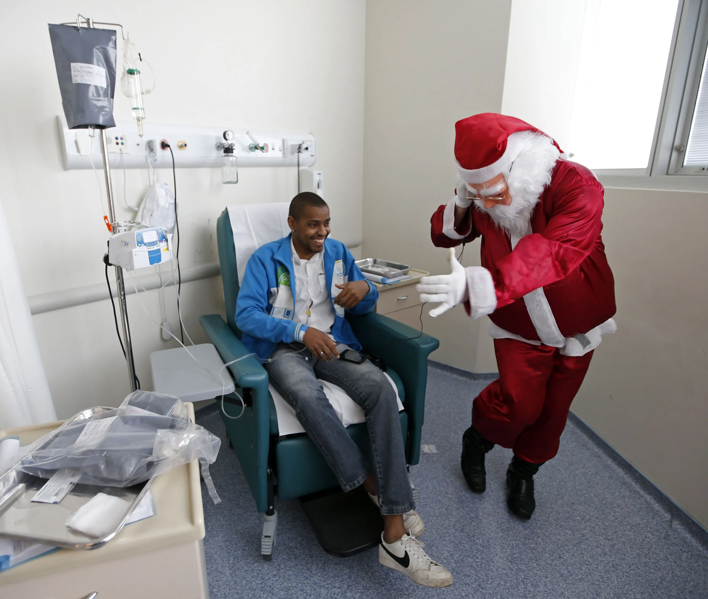 A man dressed as Santa Claus dances while listening to music on headphones borrowed from a cancer patient (L) undergoing chemotherapy in the Cancer Institute in Sao Paulo December 19, 2014. (Photo by Paulo Whitaker/Reuters)
