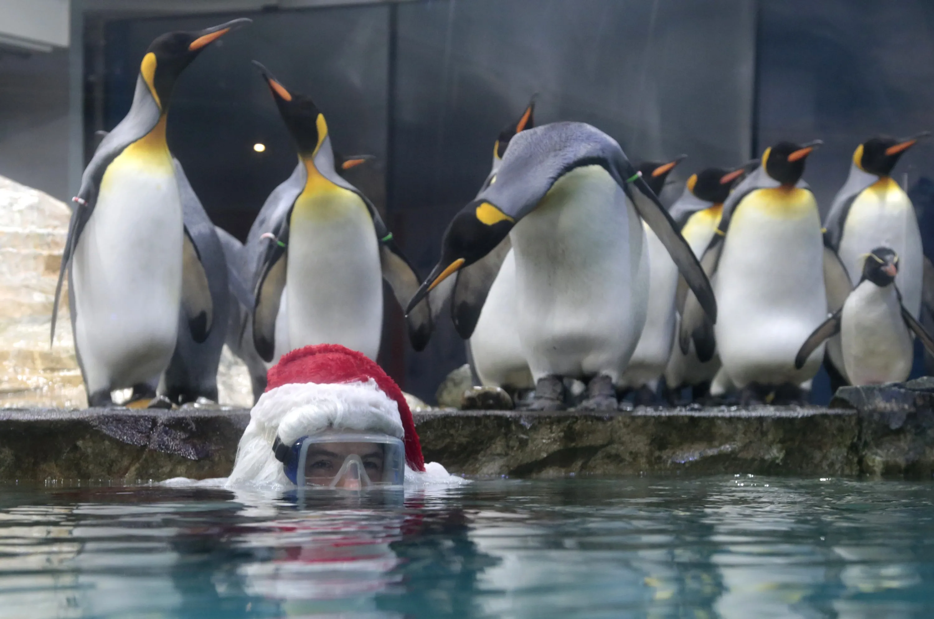 A king penguin looks over at a man dressed as Santa Claus who wears a scuba mask as he poses in their tank at the Marineland animal park in Antibes, December 19, 2014. (Photo by Eric Gaillard/Reuters)