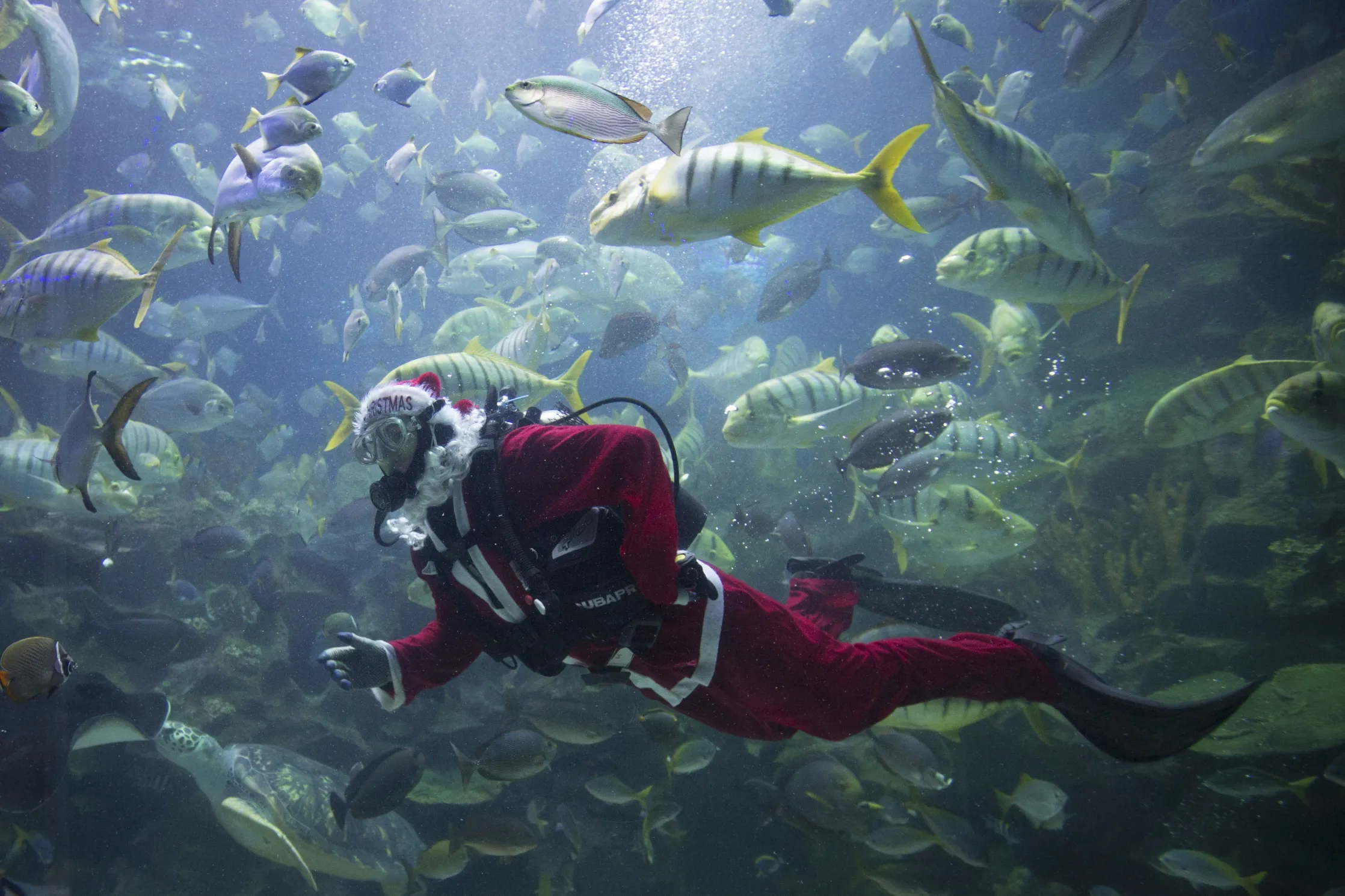 A diver in Santa costume feeds fish as part of upcoming Christmas celebrations at Aquaria KLCC underwater park in Kuala Lumpur, Malaysia on Tuesday, December 16, 2014. (Photo by Vincent Thian/AP Photo)