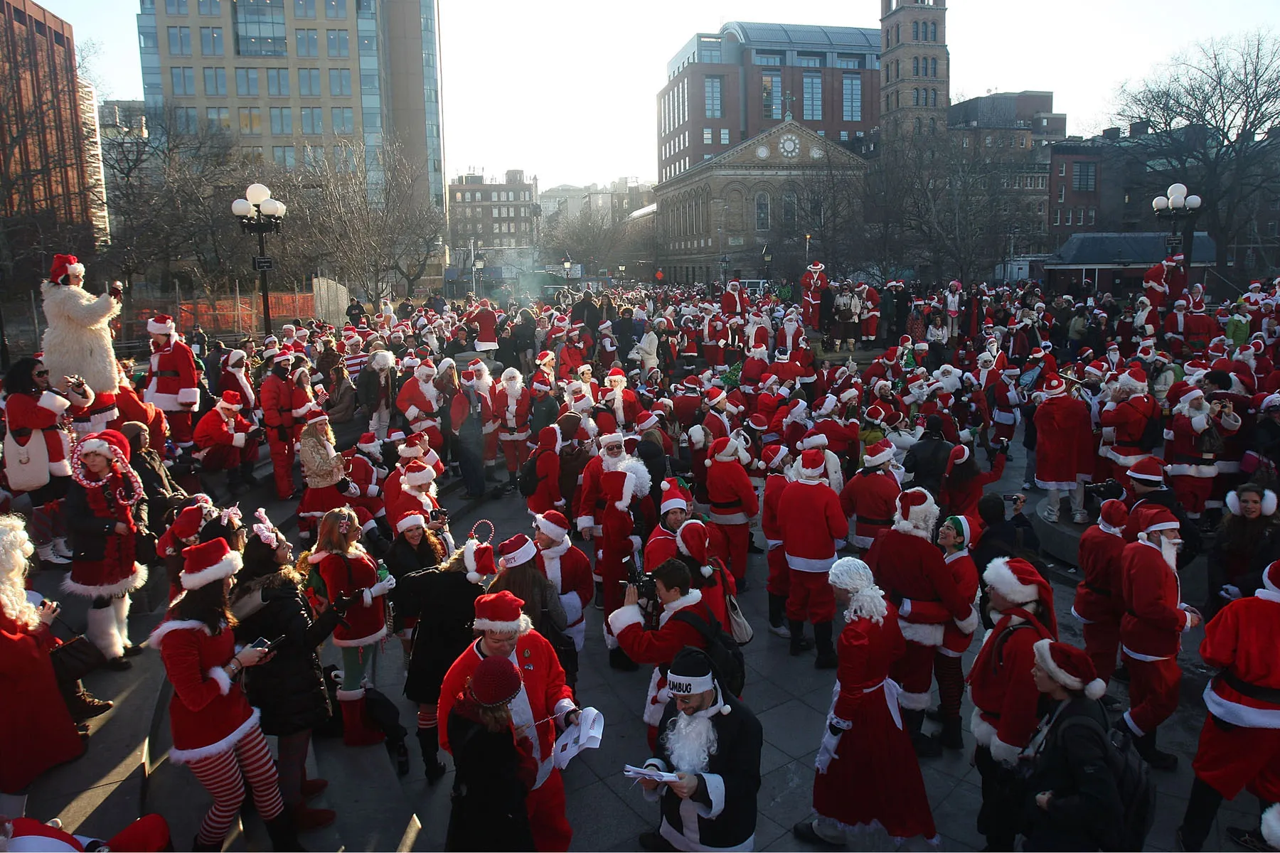 New Yorkers dressed as Santa Claus gather in Washington Square Park during the annual Santacon event December 12, 2009 in New York City. Santacon is a mass gathering of revelers dressed as Santa who take to the streets in cities across the country before Christmas. (Photo by Mario Tama/Getty Images)