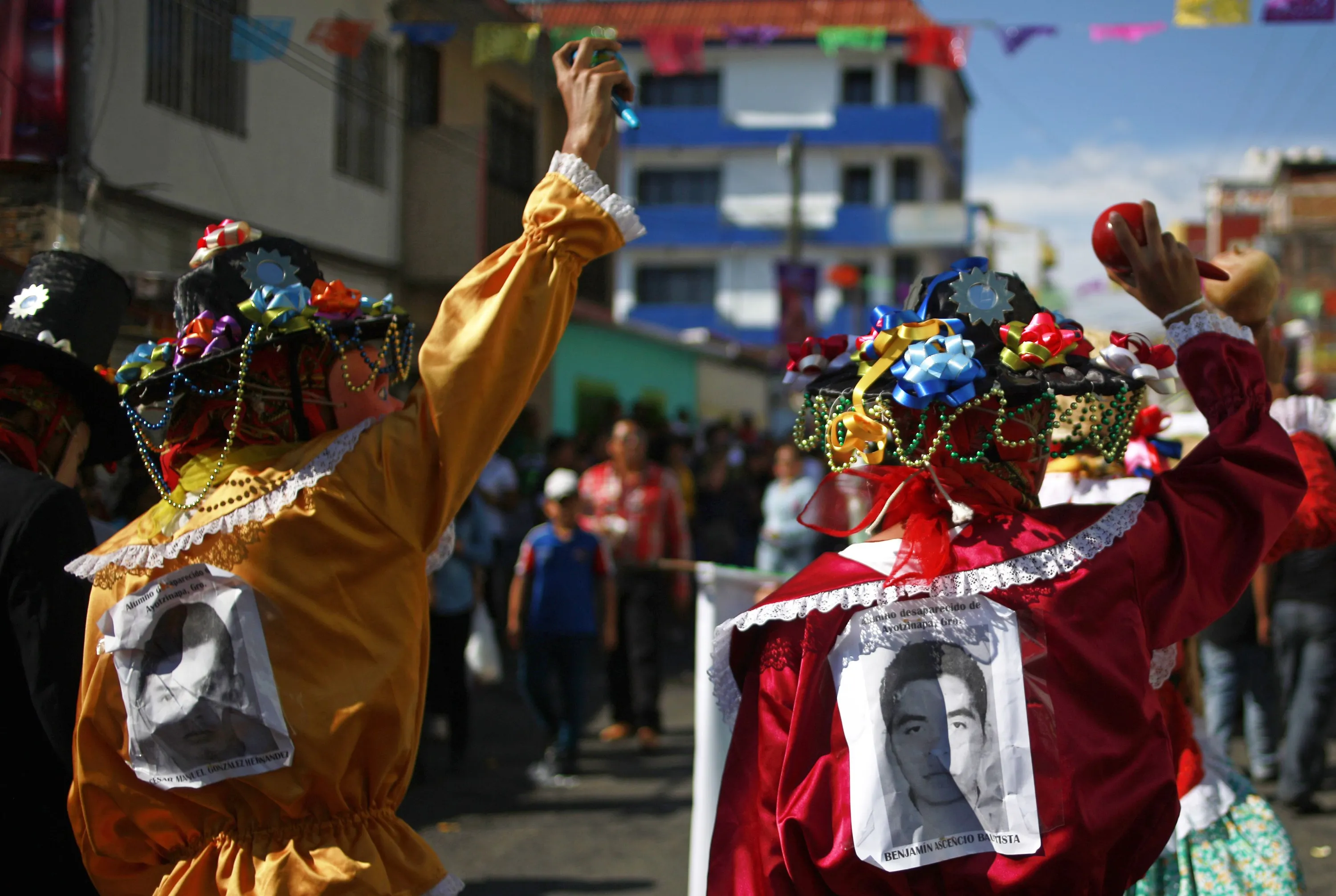 Ayotzinapa Teacher Training College Raul Isidro Burgos students perform a traditional dance with the pictures of the 43 missing students of September 26, during the “Paseo del Pendon”, a traditional artistic march in Chilpancingo, December 21, 2014. (Photo by Jorge Dan Lopez/Reuters)