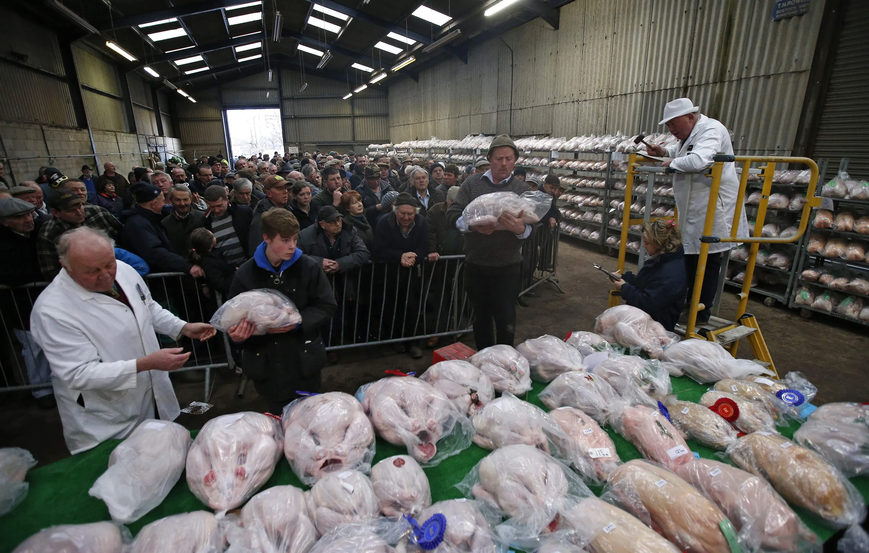 Auctioneer Roy Waller (R) starts the bidding during the Turkey and dressed poultry auction at Chelford Market, northern England December 22, 2014. (Photo by Phil Noble/Reuters)