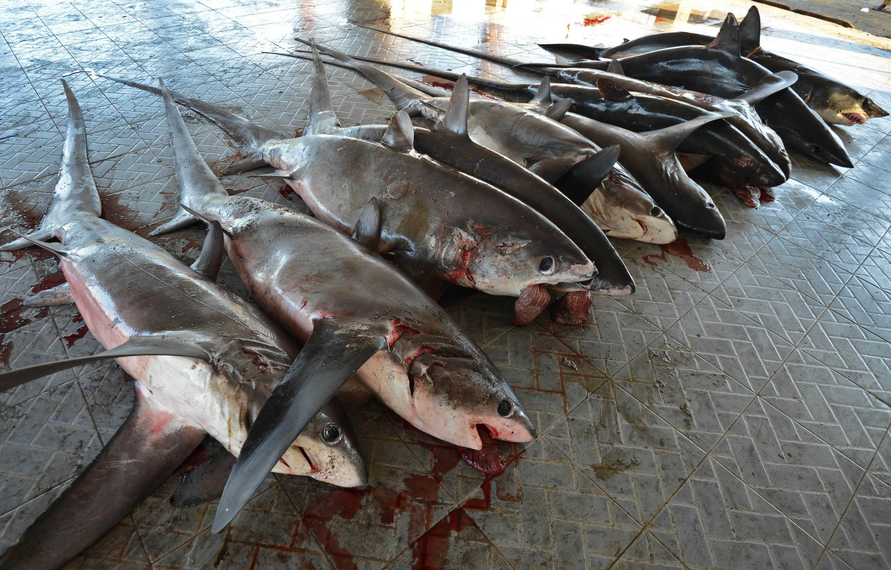 This picture taken on November 9, 2014 shows sharks for sale at a traditional market in Tanjung Luar in Lombok, West Nusa Teggara. (Photo by Sonny Tumbelaka/AFP Photo)