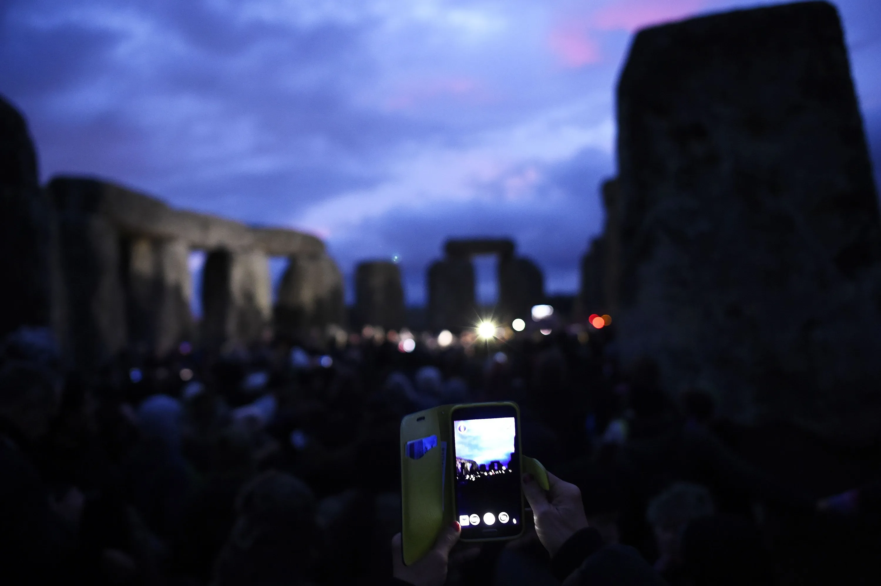 A reveller records people as they celebrate the sun rise during the winter solstice at Stonehenge on Salisbury plain in southern England December 22, 2014. (Photo by Dylan Martinez/Reuters)