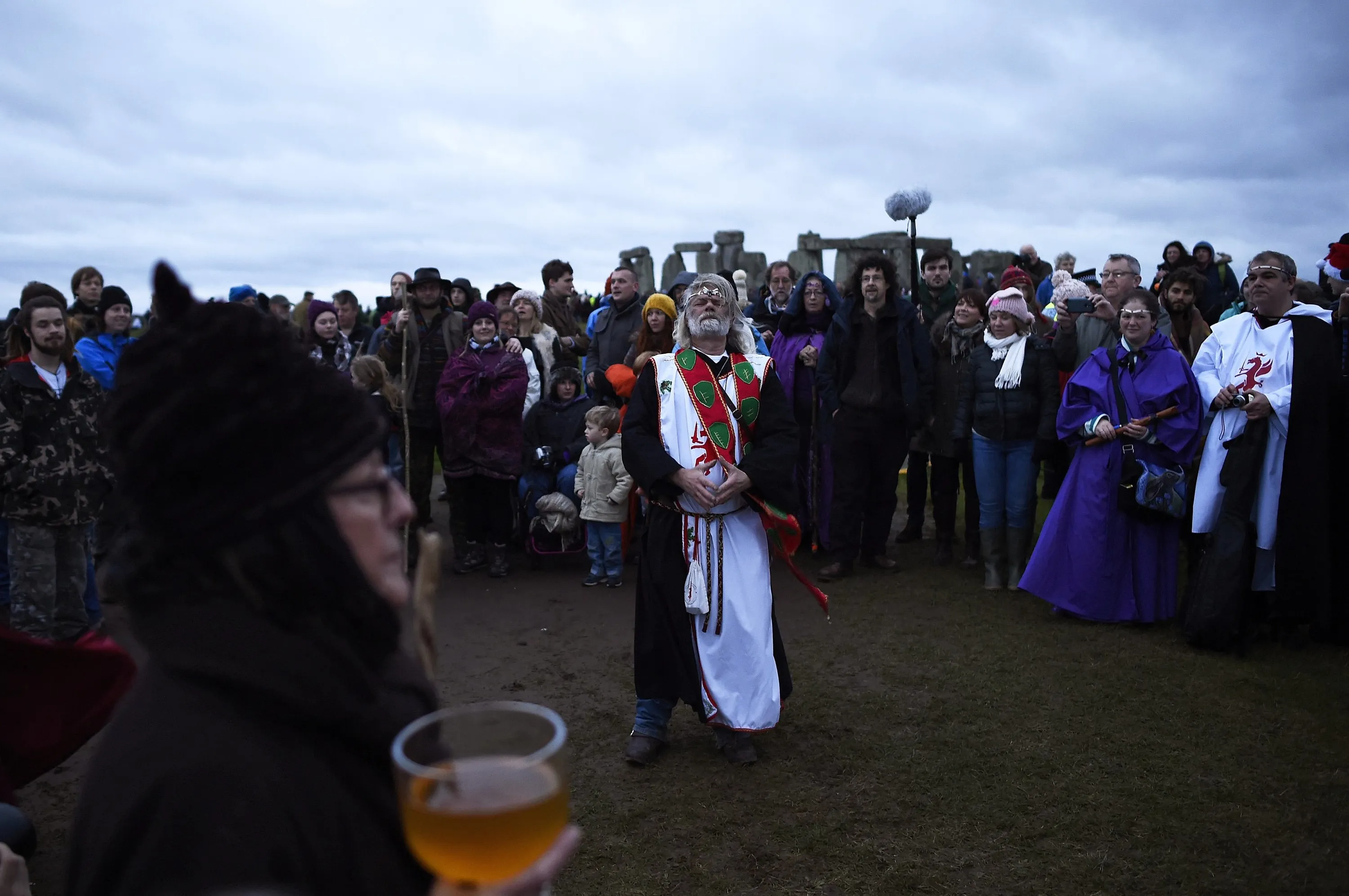 Druid Arthur Pendragon celebrates as the sun rises during the winter solstice at Stonehenge on Salisbury plain in southern England December 22, 2014. (Photo by Dylan Martinez/Reuters)