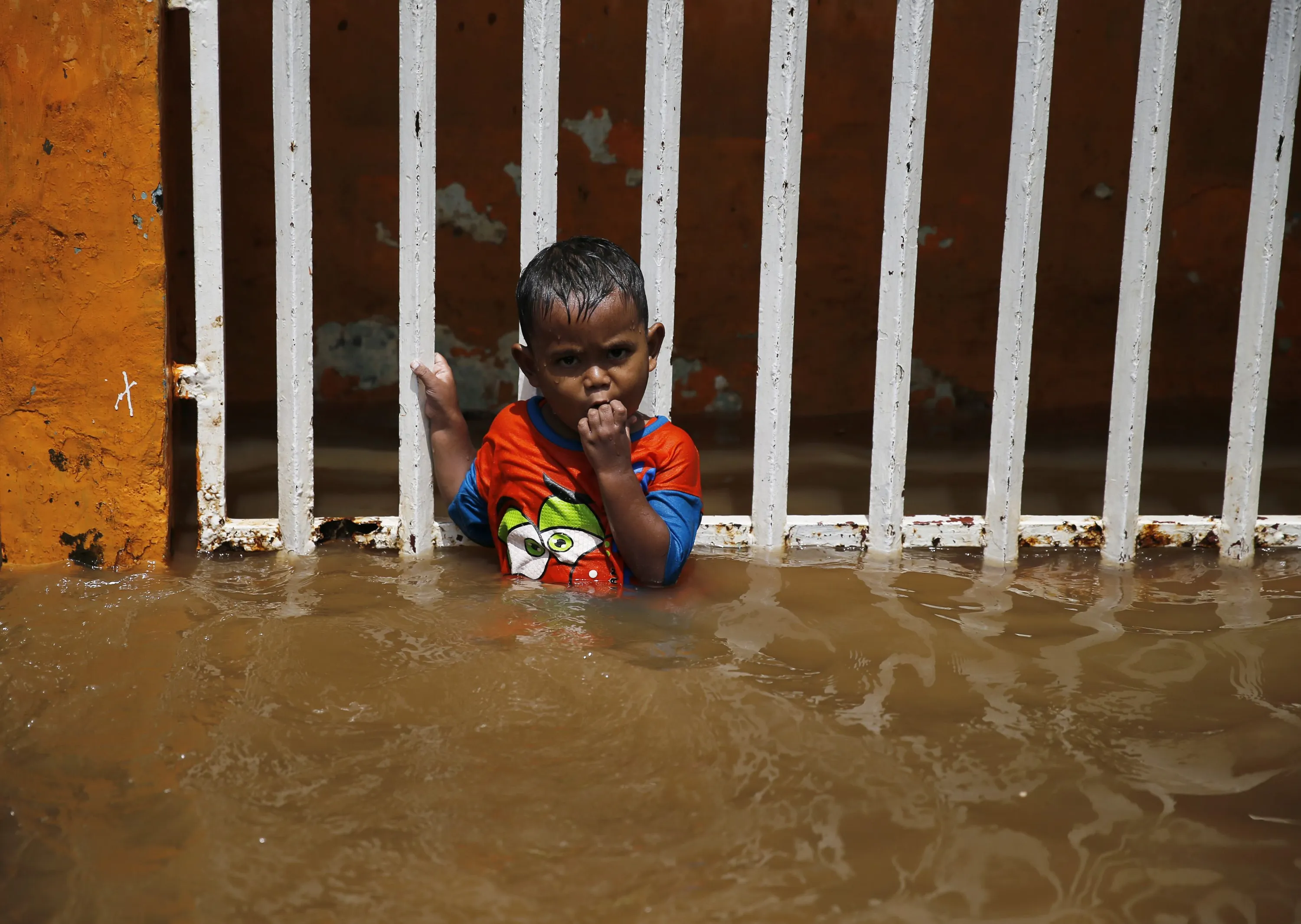 A child holds on to a fence at his house during a flood at Kampung Melayu residential area in Jakarta, December 23, 2014. (Photo by Reuters/Beawiharta)