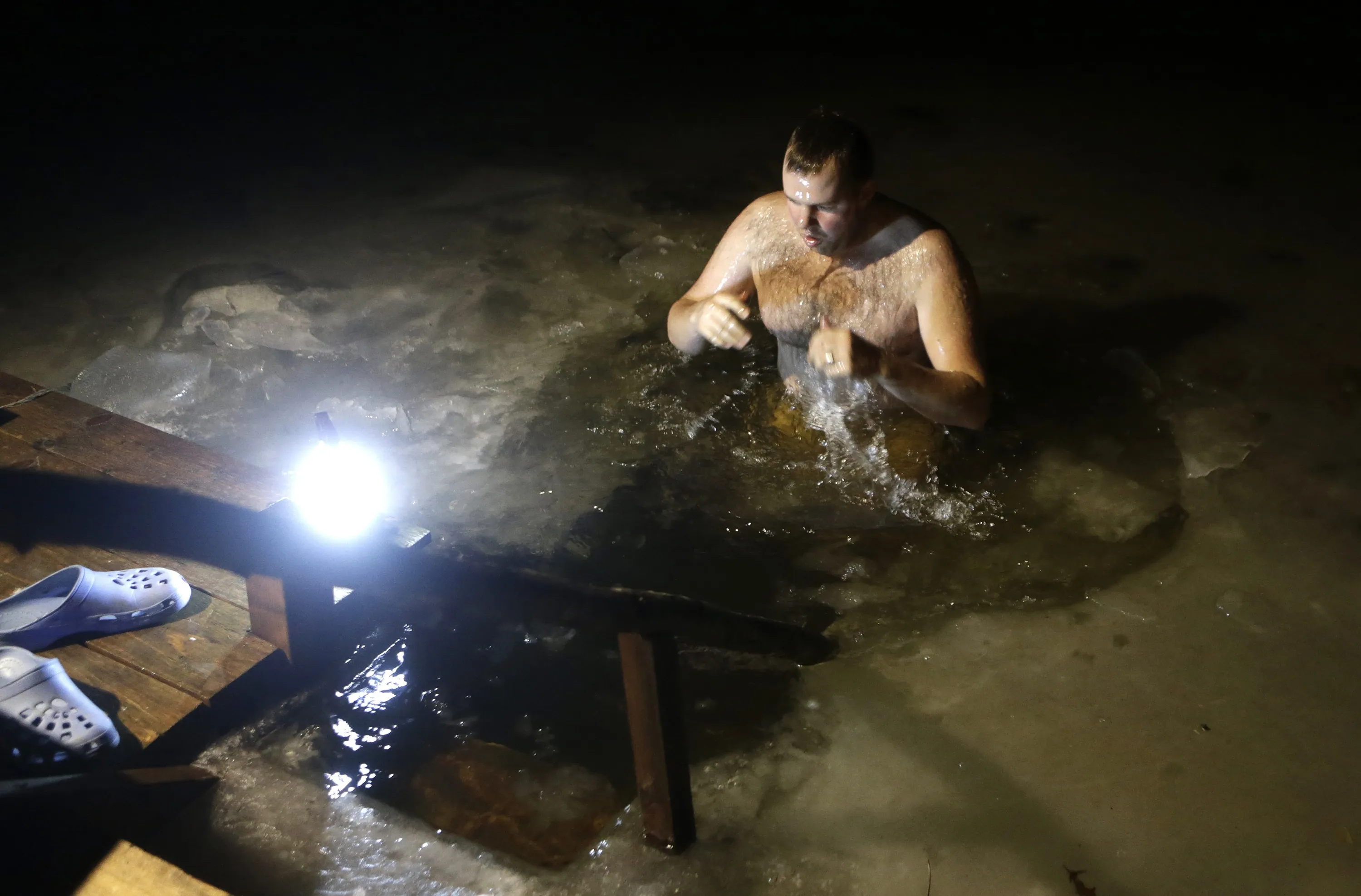 Vahur Veeroja takes a dip in cold water pool before entering the smoke sauna at Mooska farm, near the village of Haanja December 20, 2014. (Photo by Ints Kalnins/Reuters)