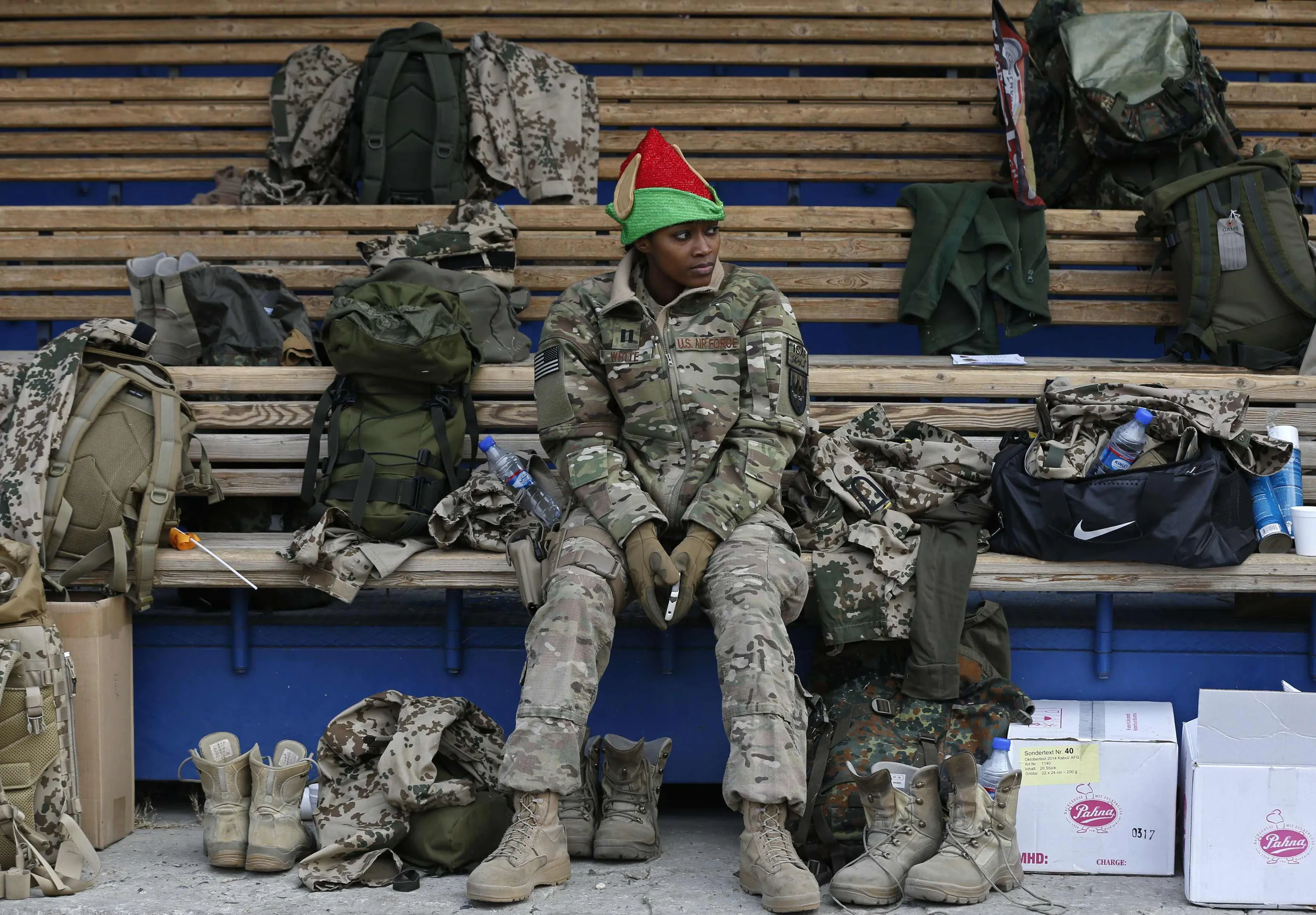 A U.S. soldier watches a football match between British and German troops commemorating the Christmas Truce of 1914, at the ISAF Headquarters in Kabul December 24, 2014. British and German soldiers deployed in Afghanistan gathered in a dusty field on Wednesday to play a game of football in memory of the Christmas Day truce spontaneously called between their armies during the First World War in 1914. (Photo by Omar Sobhani/Reuters)