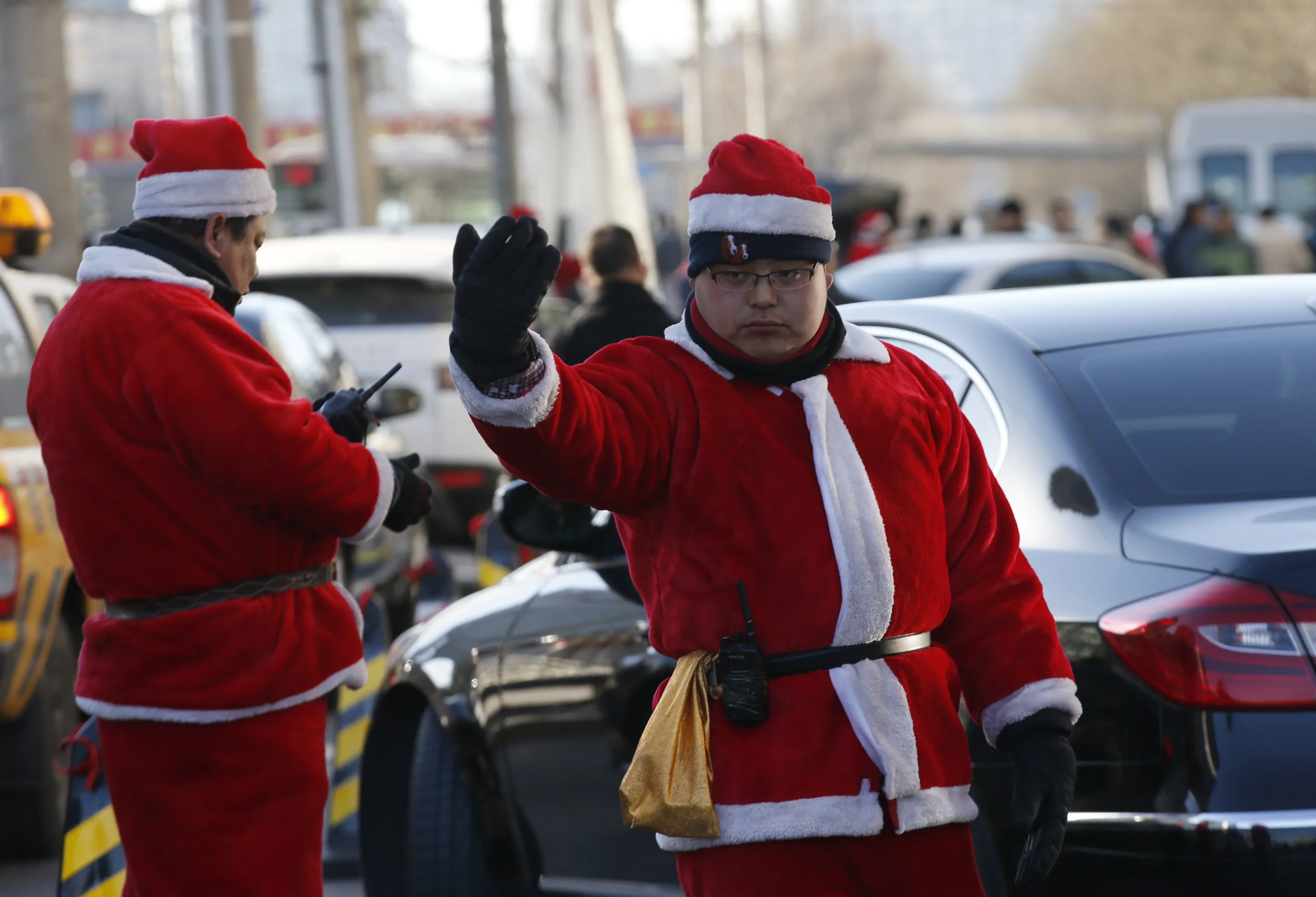 Security guards in Santa Claus costumes guide cars at a parking lot in front of a shopping mall in Beijing December 24, 2014. (Photo by Kim Kyung-Hoon/Reuters)