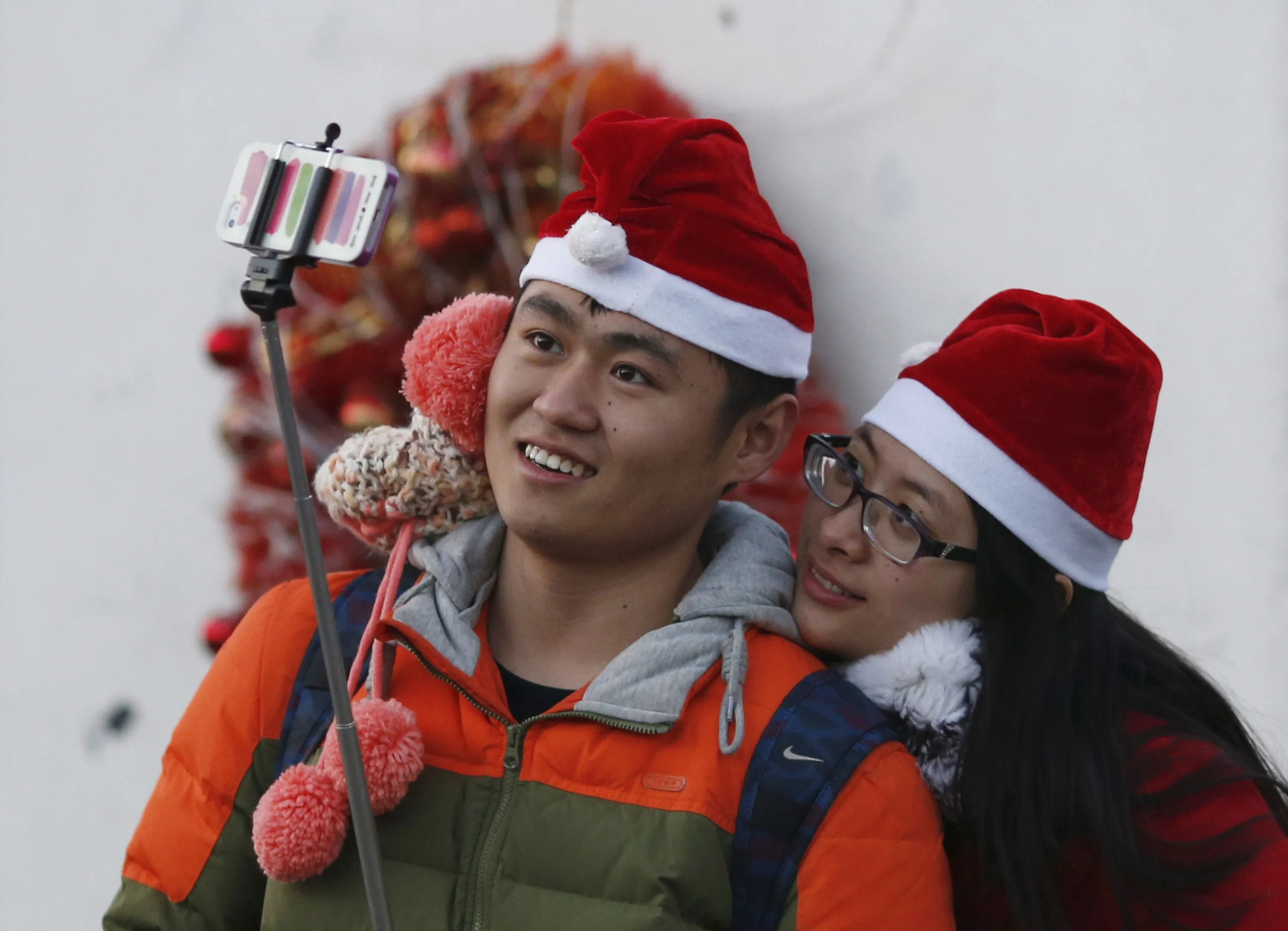A couple wearing Santa hats take a “selfie” at a Catholic church in Beijing December 24, 2014. (Photo by Kim Kyung-Hoon/Reuters)