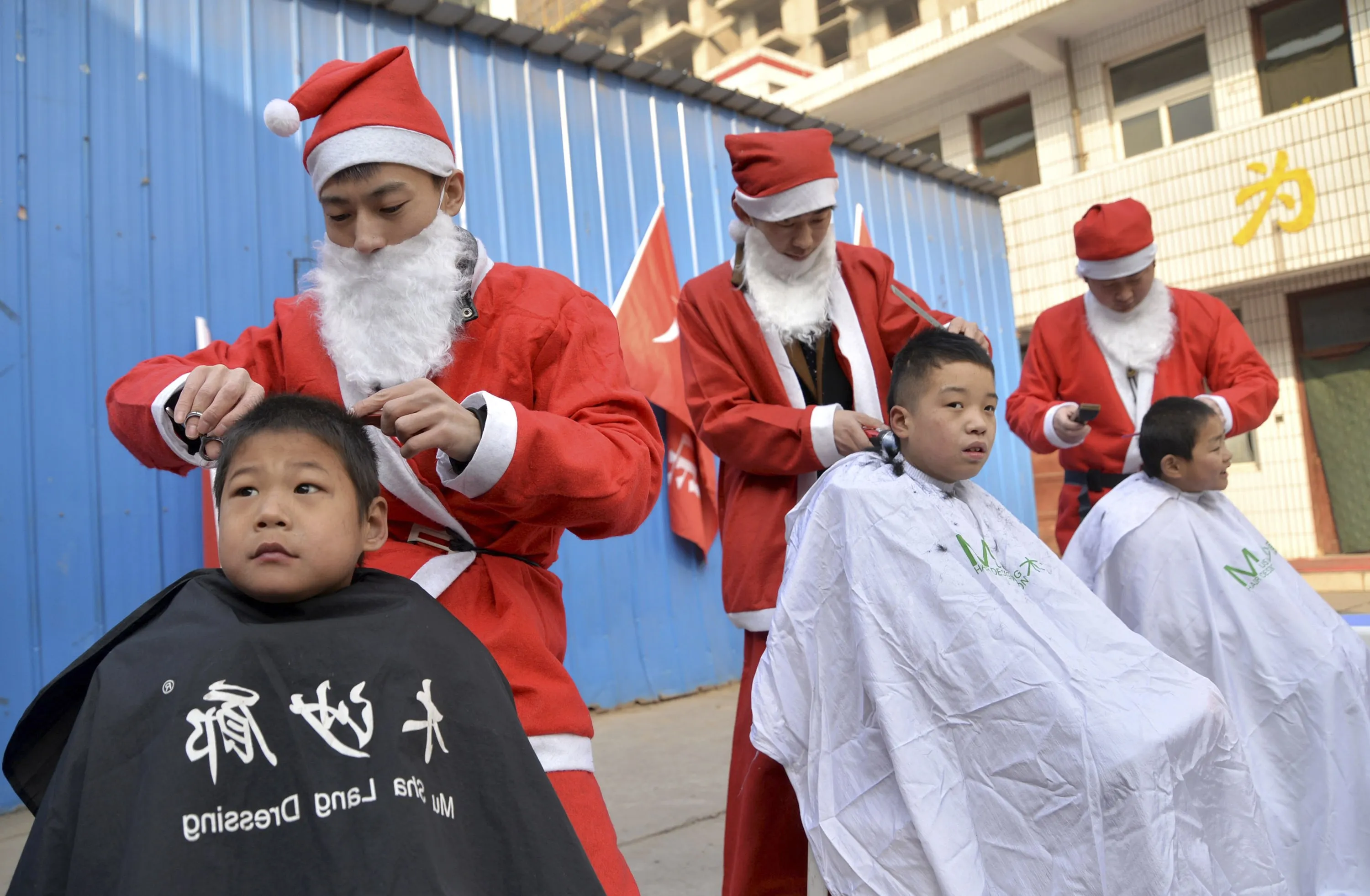 Volunteers in Santa Claus costumes give free hair cuts to children at a welfare house to celebrate the upcoming Christmas festivities in Handan, Hebei province December 24, 2014. (Photo by Reuters/Stringer)