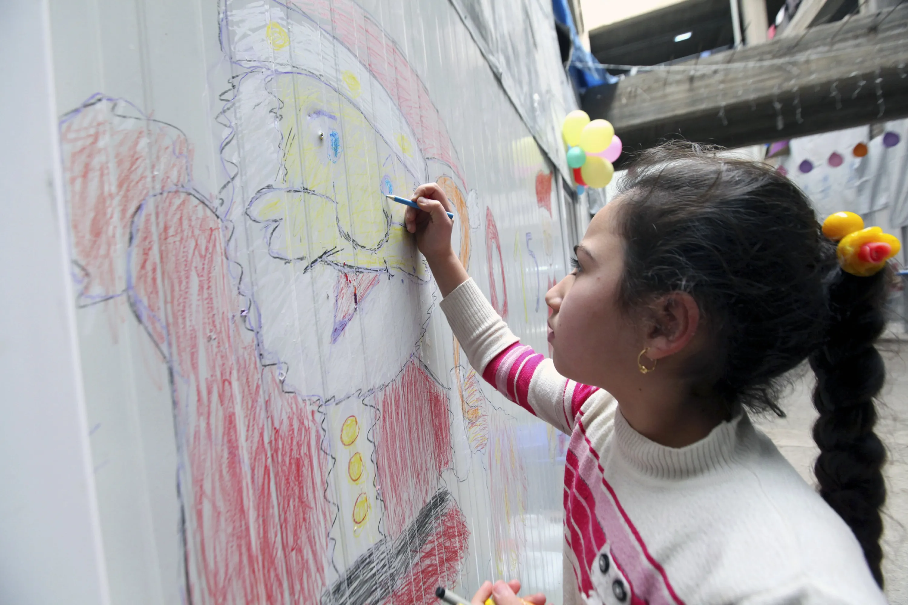 A displaced Iraqi Christian girl who fled from Islamic State militants in Mosul, draws a picture of Santa Claus at a mall still under construction, used as a refugee camp in Arbil December 24, 2014. (Photo by Azad Lashkari/Reuters)