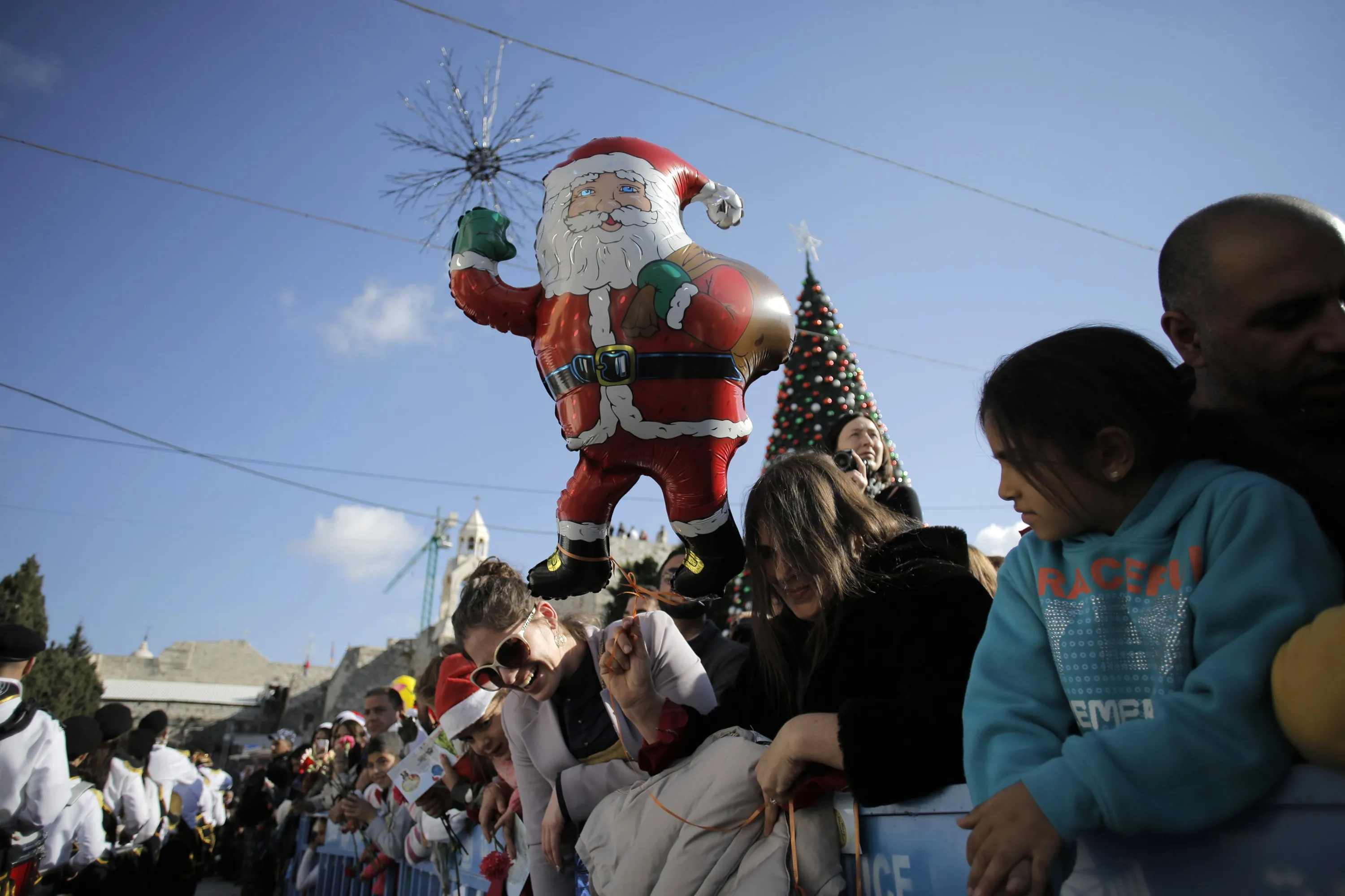 People watch Christmas celebrations outside the Church of the Nativity, the site revered by Christians as Jesus' birthplace, in the West Bank town of Bethlehem December 24, 2014. (Photo by Ammar Awad/Reuters)