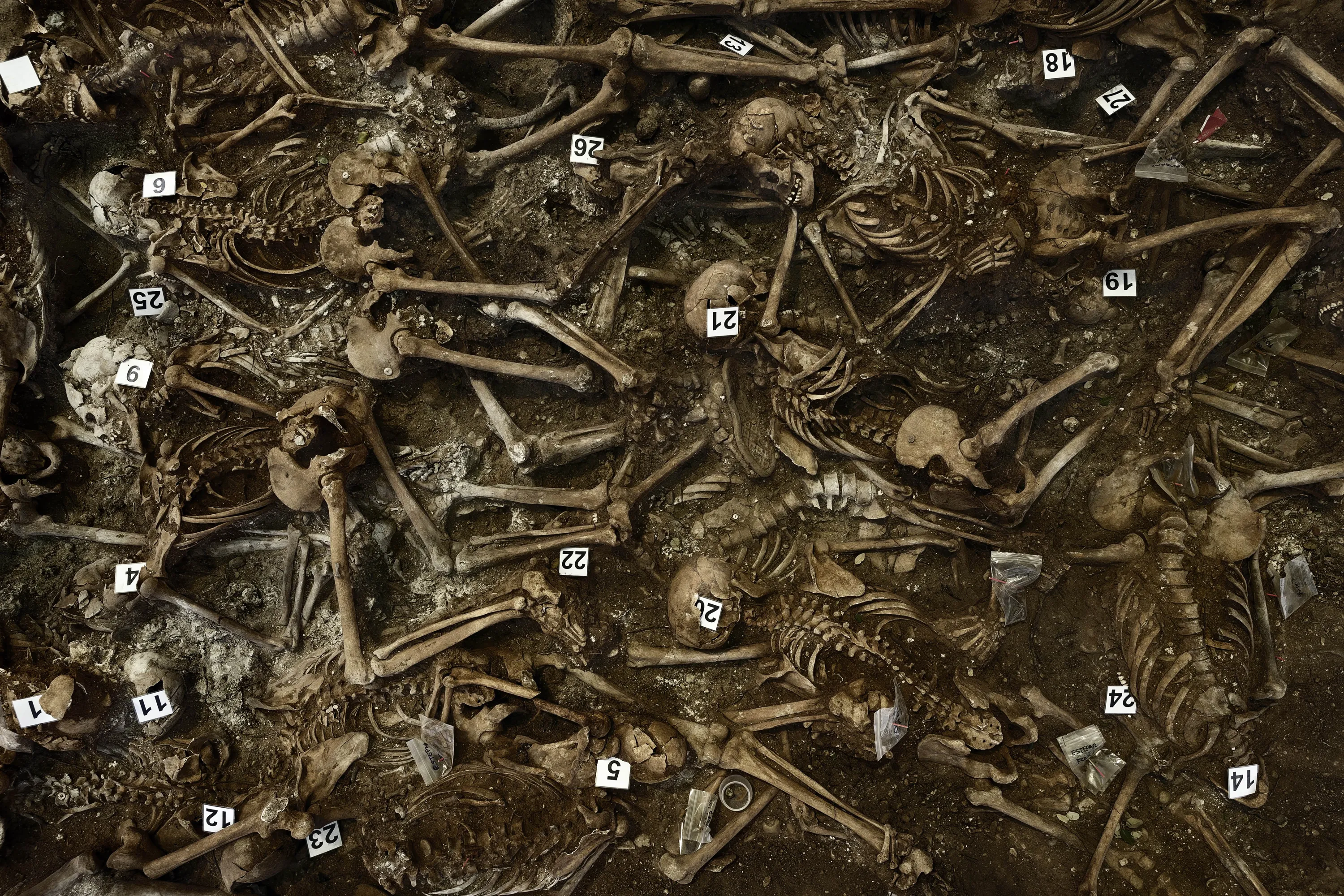 In this photo taken on July 26, 2014, skeletons are numbered on what was a hidden mass grave, during an excavation by the Aranzadi Sciences Society searching for the remains of those killed by their political ideology during and after the Spanish civil war in El Estepar, Spain. (Photo by Daniel Ochoa de Olza/AP Photo)