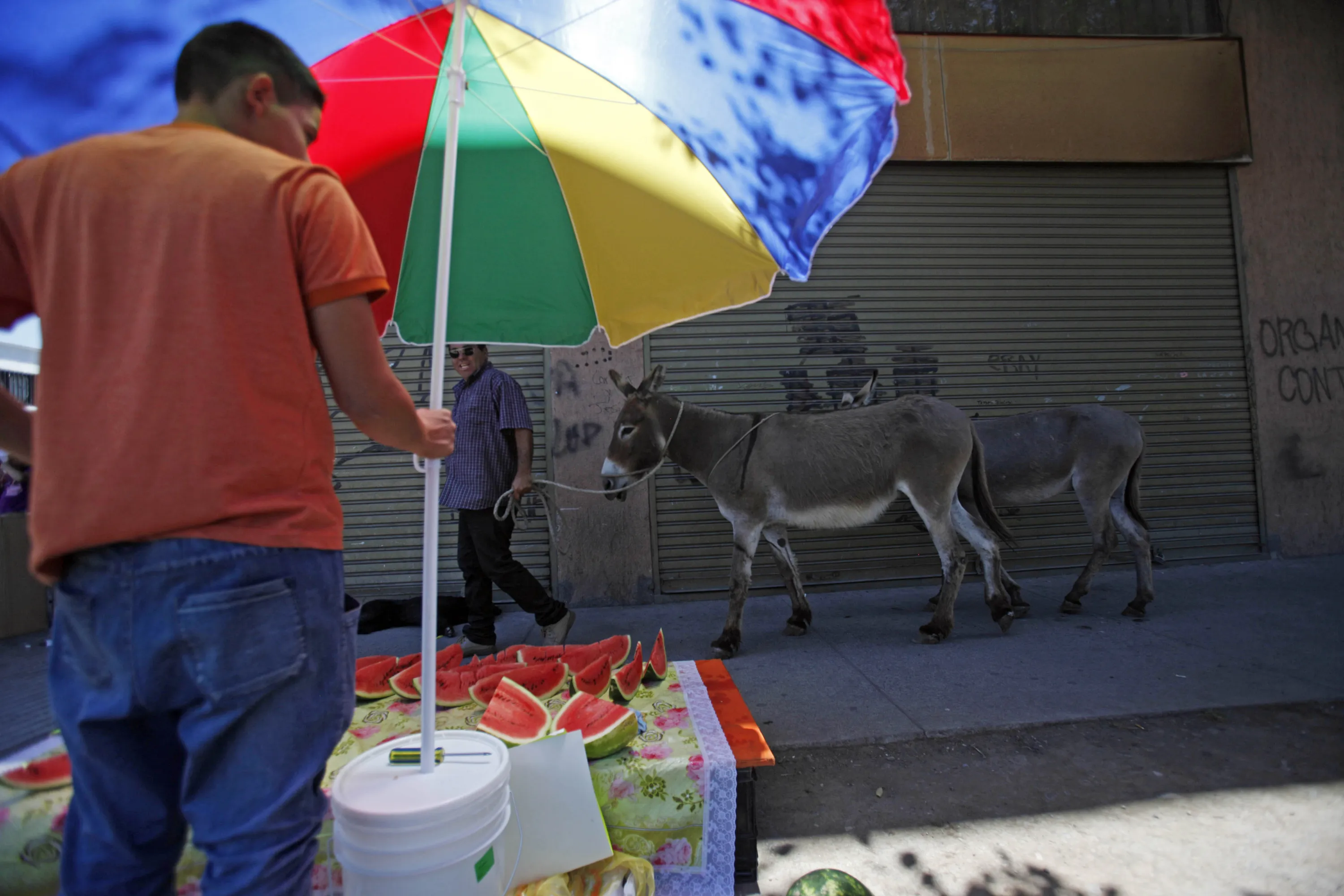 In this December 13, 2914, Ricardo Alegria walks his donkeys past a watermelon stand as he works to sell their fresh milk in Santiago, Chile. Ricardo Alegria said the milk is taken as a vitamin jolt for babies with gastric problems, and researchers at the University of Camerino in Italy have reported it can be a good substitute for children with allergies to cow's milk. But adults too often drink it. (Photo by Luis Hidalgo/AP Photo)
