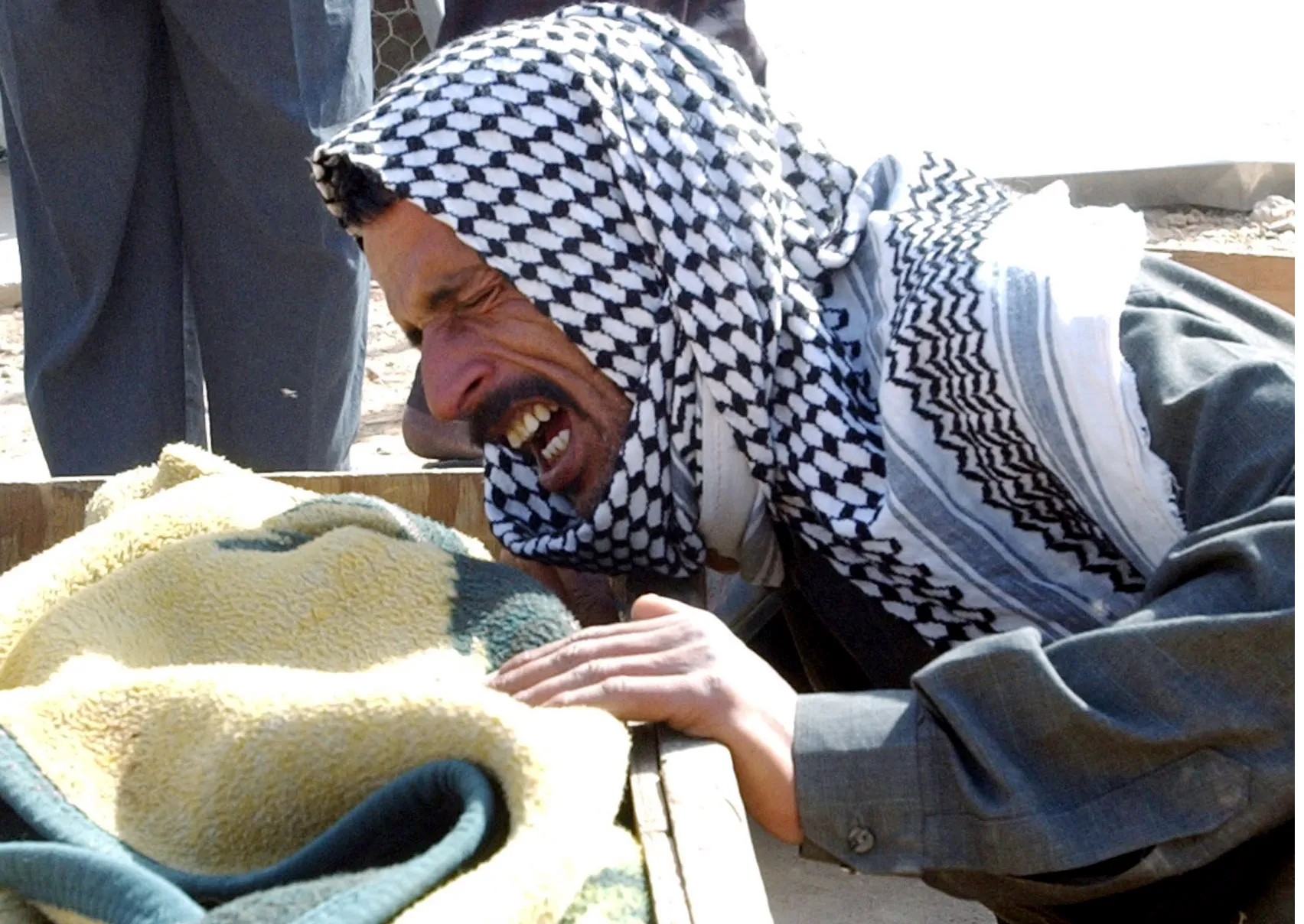 Karem Mohammed weeps over the bodies of his family, inluding his six children, his wife, two brothers, mother and father in Al Hillah, Iraq120 kilometers south of Baghdad, Tuesday April 1, 2003. Hospital officials said over 300 were injured and 33 died during coalition air raids over the area. Karem, from Nasariya, had come to Al Hillal for safety. (Photo by Ali Heider/AP Photo)