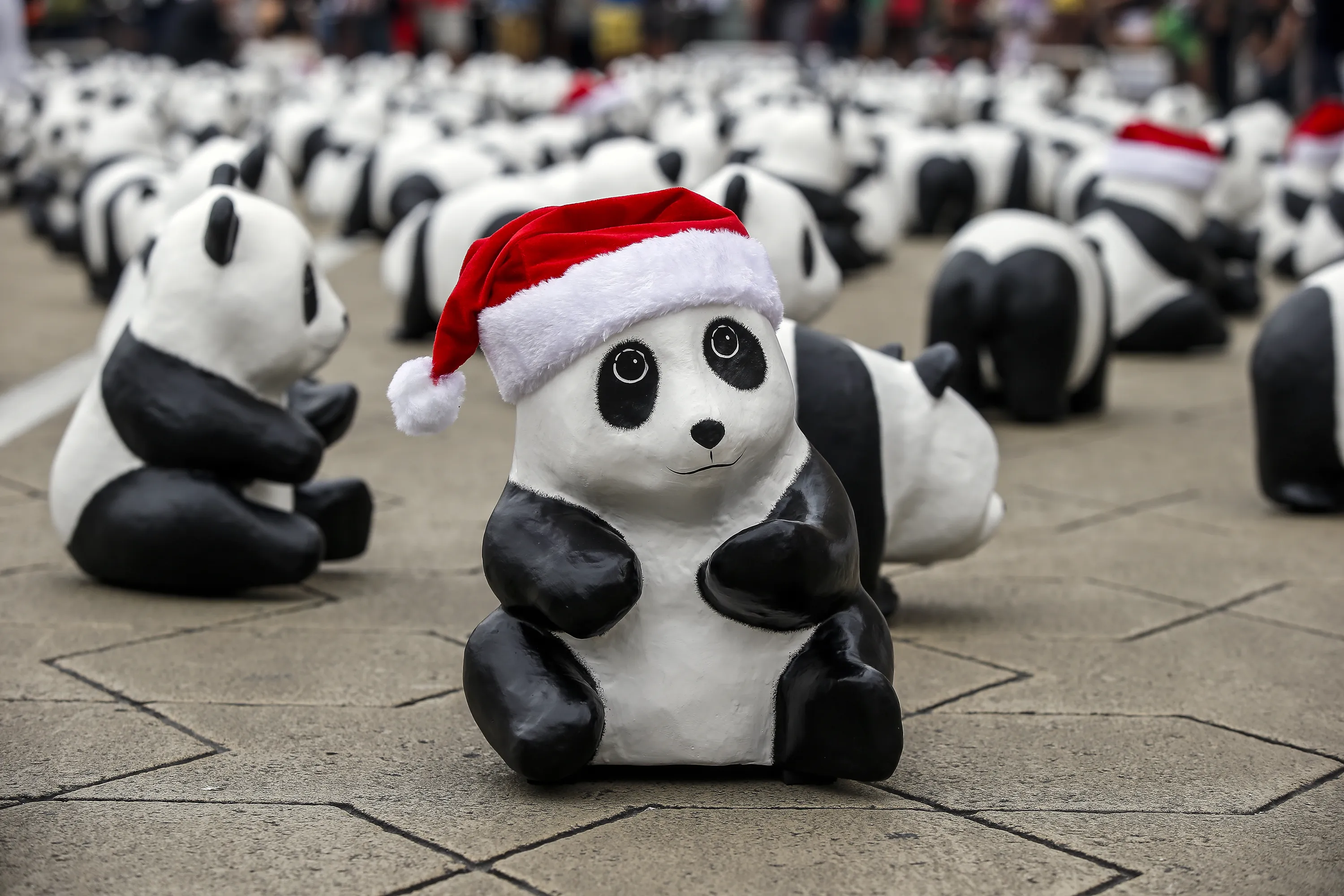 A paper panda wearing a Santa Claus hat is displayed in front of the Sultan Abdul Samad building, a Malaysian iconic building, in Kuala Lumpur, Malaysia, December 21, 2014. The Paper pandas were created by French artist Paulo Grangeon, who crafted 1,600 pandas. The creations, which were made in six different shape and size, will visit more than 15 iconic landmarks in Malaysia under the theme “Initiating the Culture of Creative Conservation”. The tour will run from December 21, 2014 to January 25, 2015 to promote the message of panda conservation and sustainable development. The 1,600 paper pandas mark the number of the current living pandas left in the wild. (Photo by Azhar Rahim/EPA)