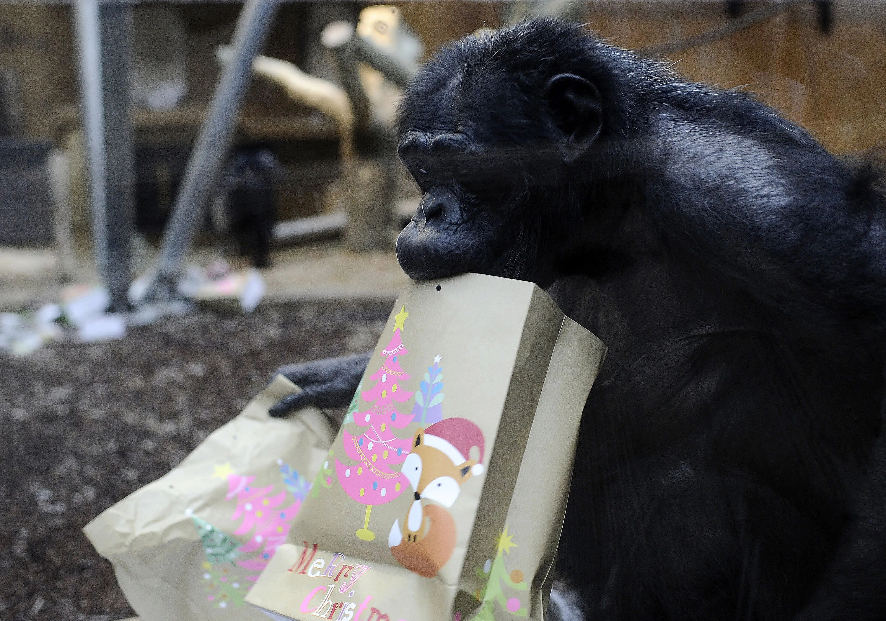 A Chimpanzee carries Christmas goody bags at Hannover Zoo on December 22, 2014 in Hanover, Germany. Chimpanzees and polar bears received early Christmas gifts today from zoo keepers two days before Christmas. (Photo by Alexander Koerner/Getty Images)