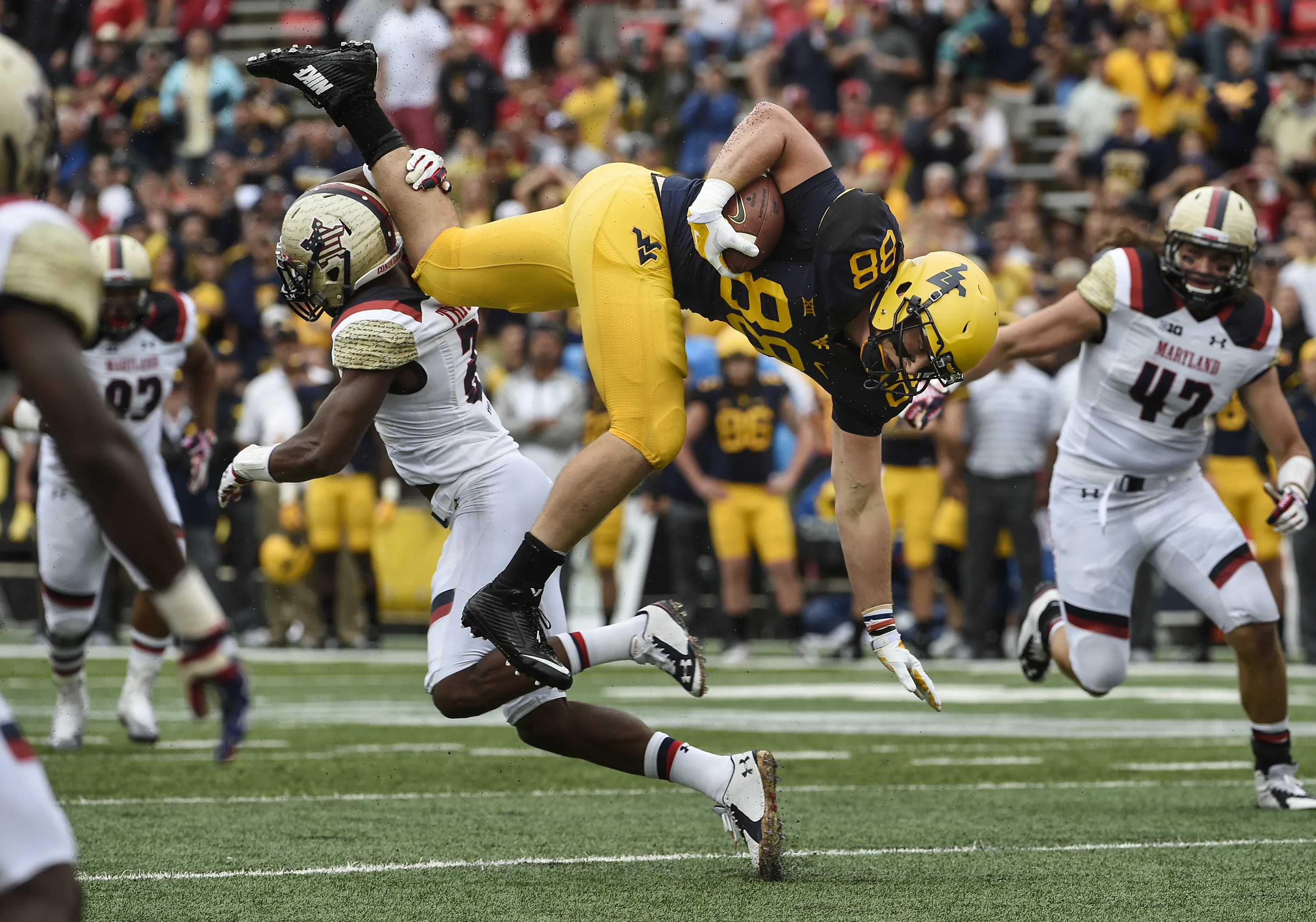 Maryland Terrapins defensive back Sean Davis (21) upends West Virginia Mountaineers running back Cameron Nash (38) in the first quarter during the game against West Virginia at Byrd Stadium on Saturday, September 13, 2014. (Photo by Toni L. Sandys/The Washington Post)
