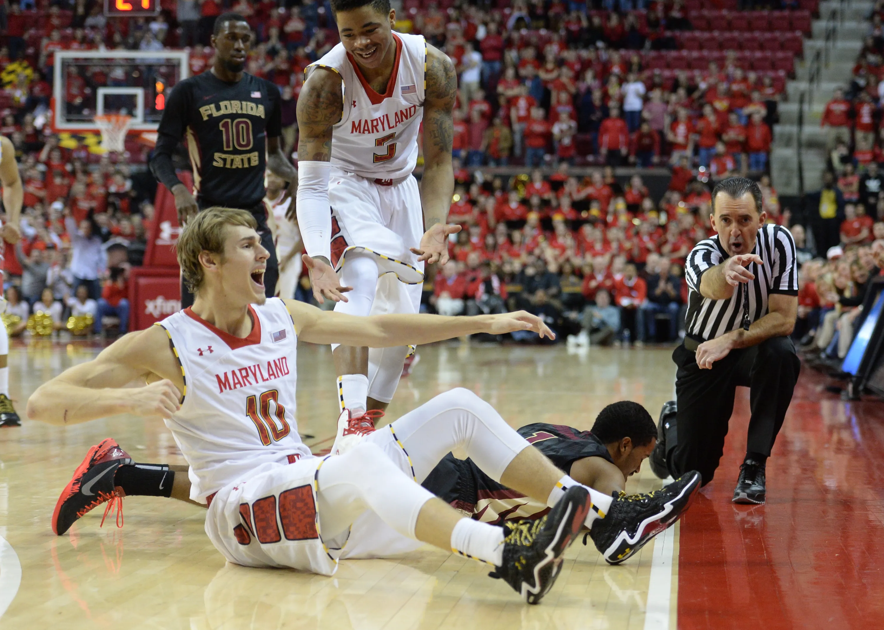 Maryland Terrapins forward Jake Layman (10) celebrates as the official rules the ball out of bounds for a Maryland possession during the final minutes of action against Florida State on February 7, 2014 in College Park, MD. (Photo by Jonathan Newton/The Washington Post)