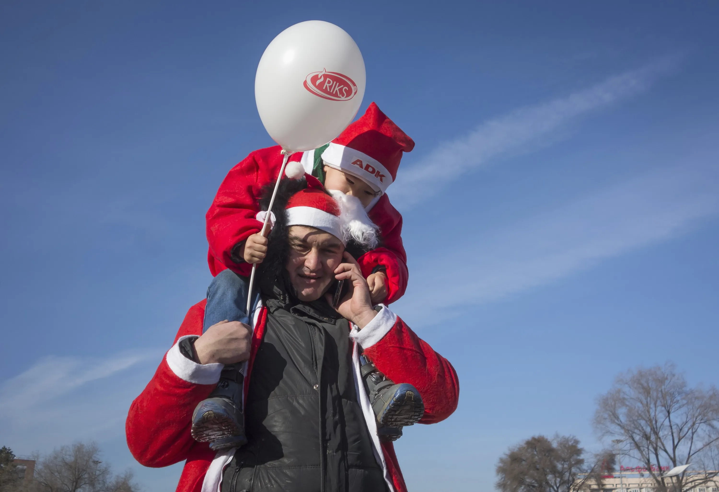 A man talks on a phone as he carries his son dressed as Father Frost, the equivalent of Santa Claus, during a parade in Almaty December 28, 2014. (Photo by Shamil Zhumatov/Reuters)