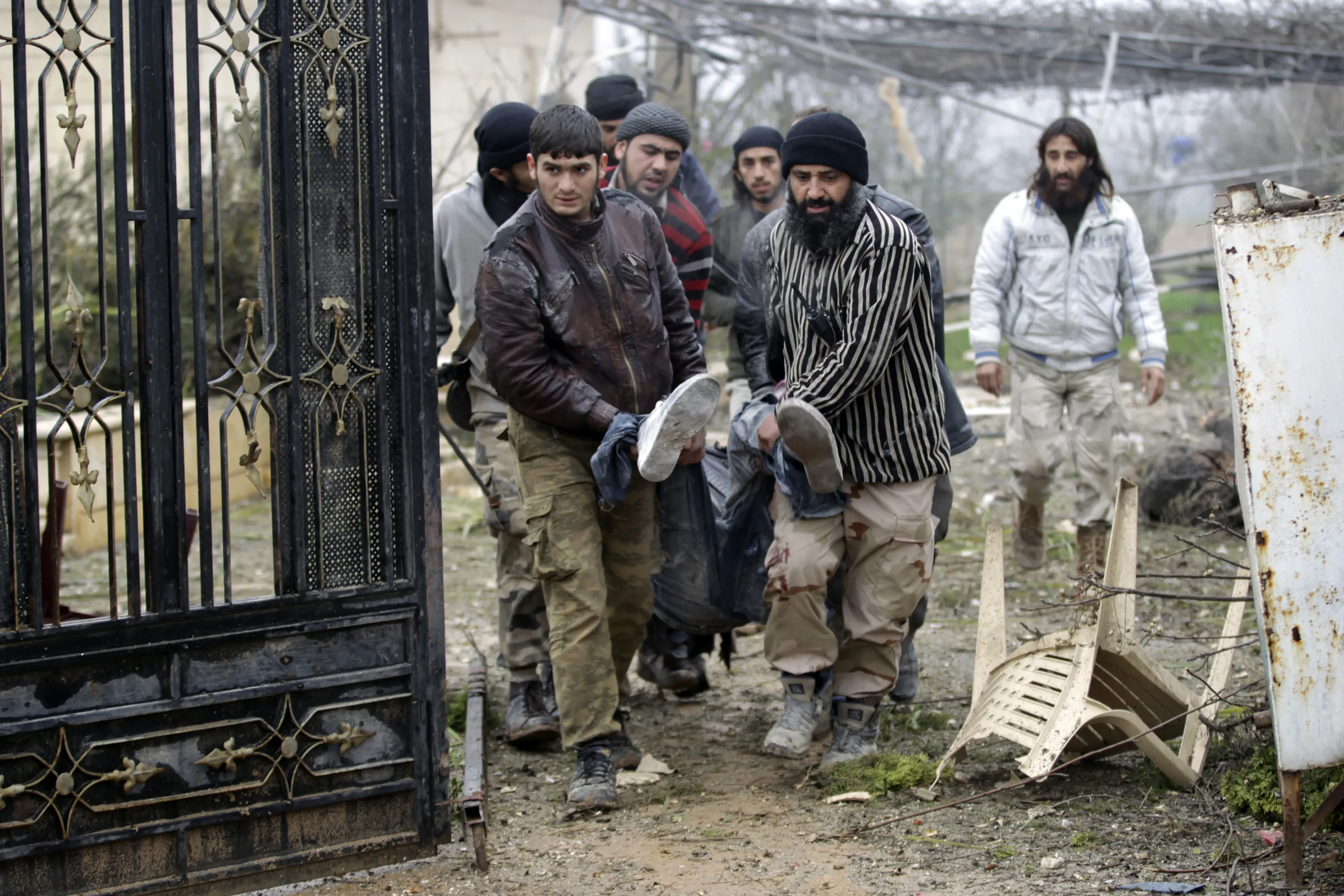 Ahrar al-Sham Islamic fighters carry a fellow fighter who was killed in airstrikes around al-Hamidiyeh base, one of two military posts they took control of from forces loyal to Syria's President Bashar al-Assad in the southern Idlib countryside, December 19, 2014. (Photo by Khalil Ashawi/Reuters)