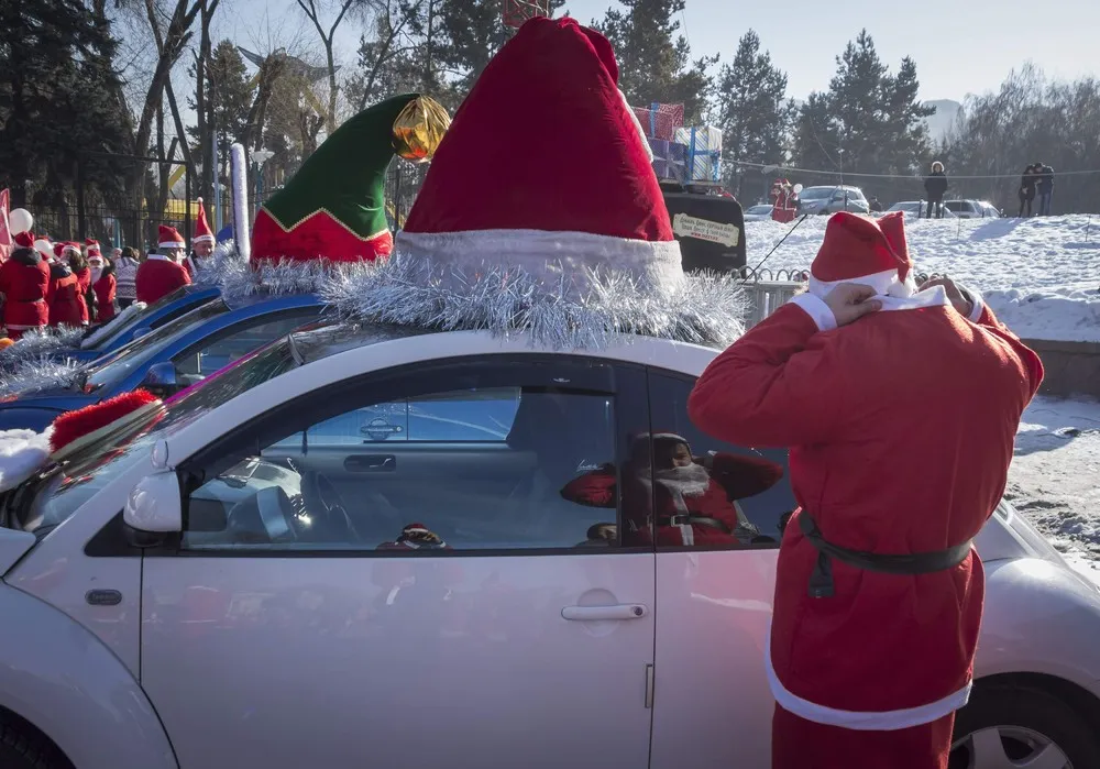 A reveler dressed as Father Frost, the equivalent of Santa Claus, adjusts his costume during a parade in Almaty December 28, 2014. (Photo by Shamil Zhumatov/Reuters)