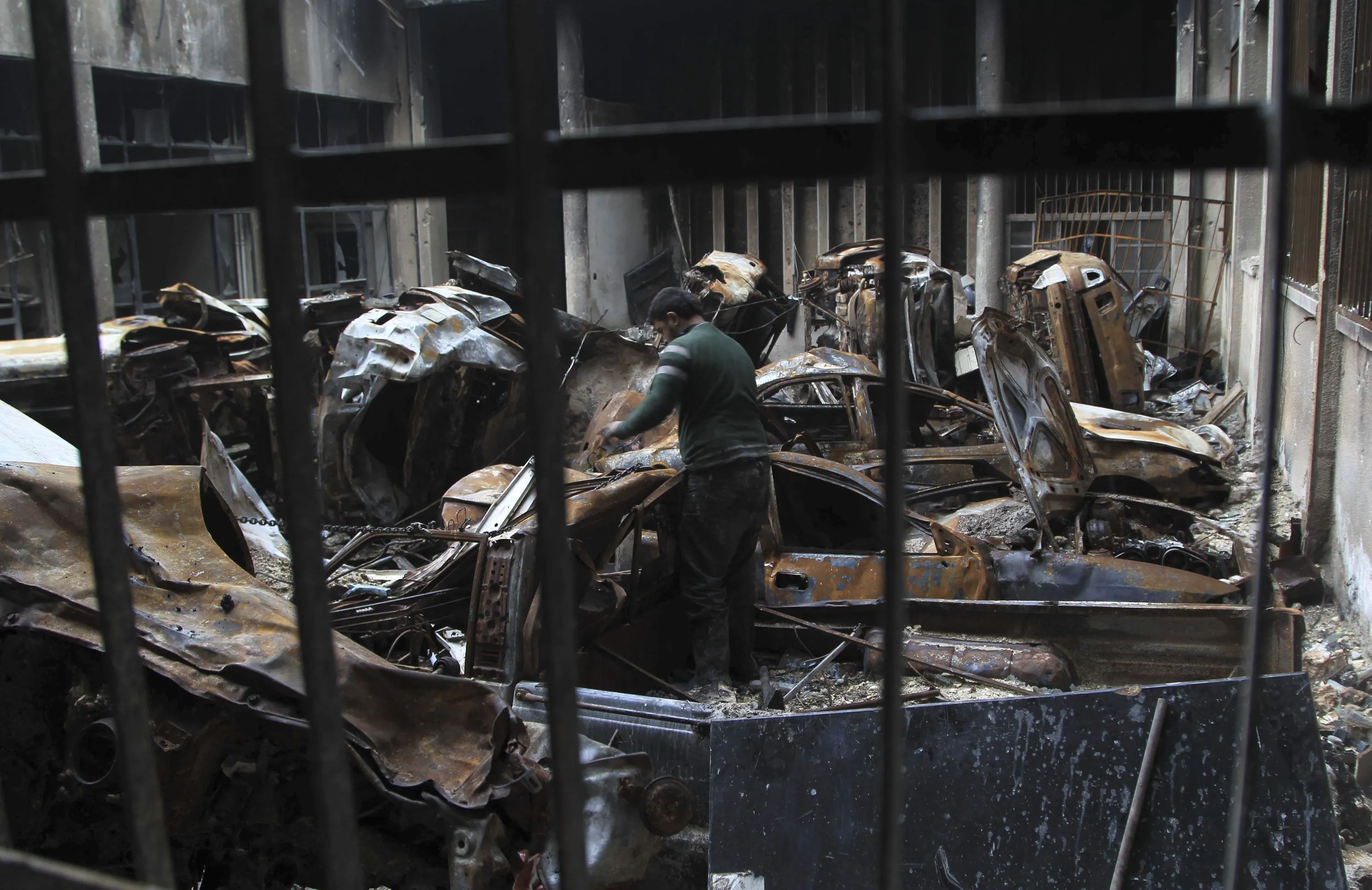 A man takes parts from damaged vehicles parked at the justice palace compound controlled by rebel fighters near Aleppo's historic citadel, where forces loyal to Syria's President Bashar al-Assad are stationed December 28, 2014. (Photo by Jalal Al-Mamo/Reuters)