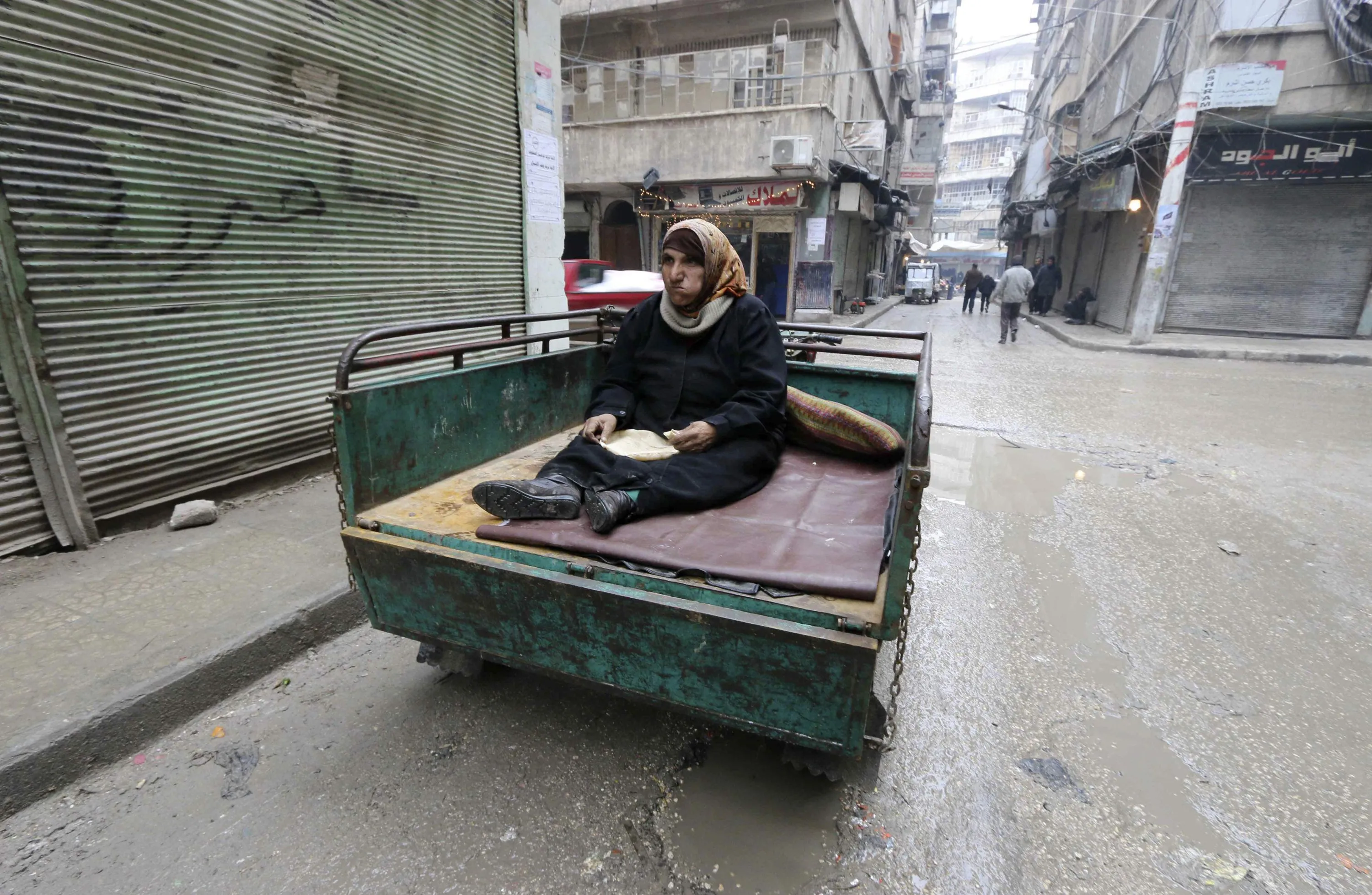 A woman eats bread as she sits on a pick-up truck in al-Shaar neighbourhood of Aleppo December 28, 2014. (Photo by Abdalrhman Ismail/Reuters)