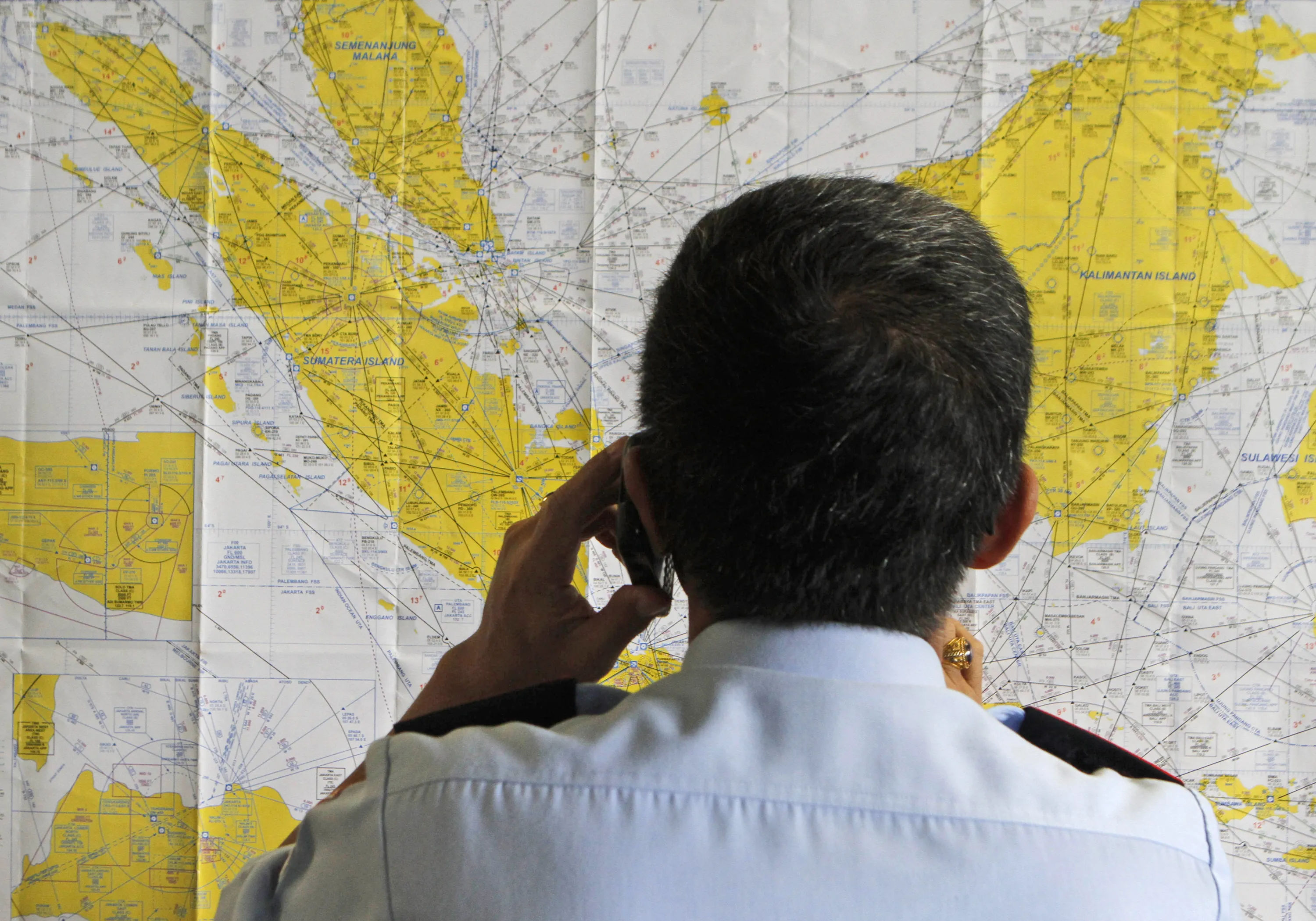 An airport official checks a map of Indonesia at the crisis center set up by local authority for the missing AirAsia flight QZ8501, at Juanda International Airport in Surabaya, East Java, Indonesia, Sunday, Dec. 28, 2014. (Photo by AP Photo/Trisnadi)