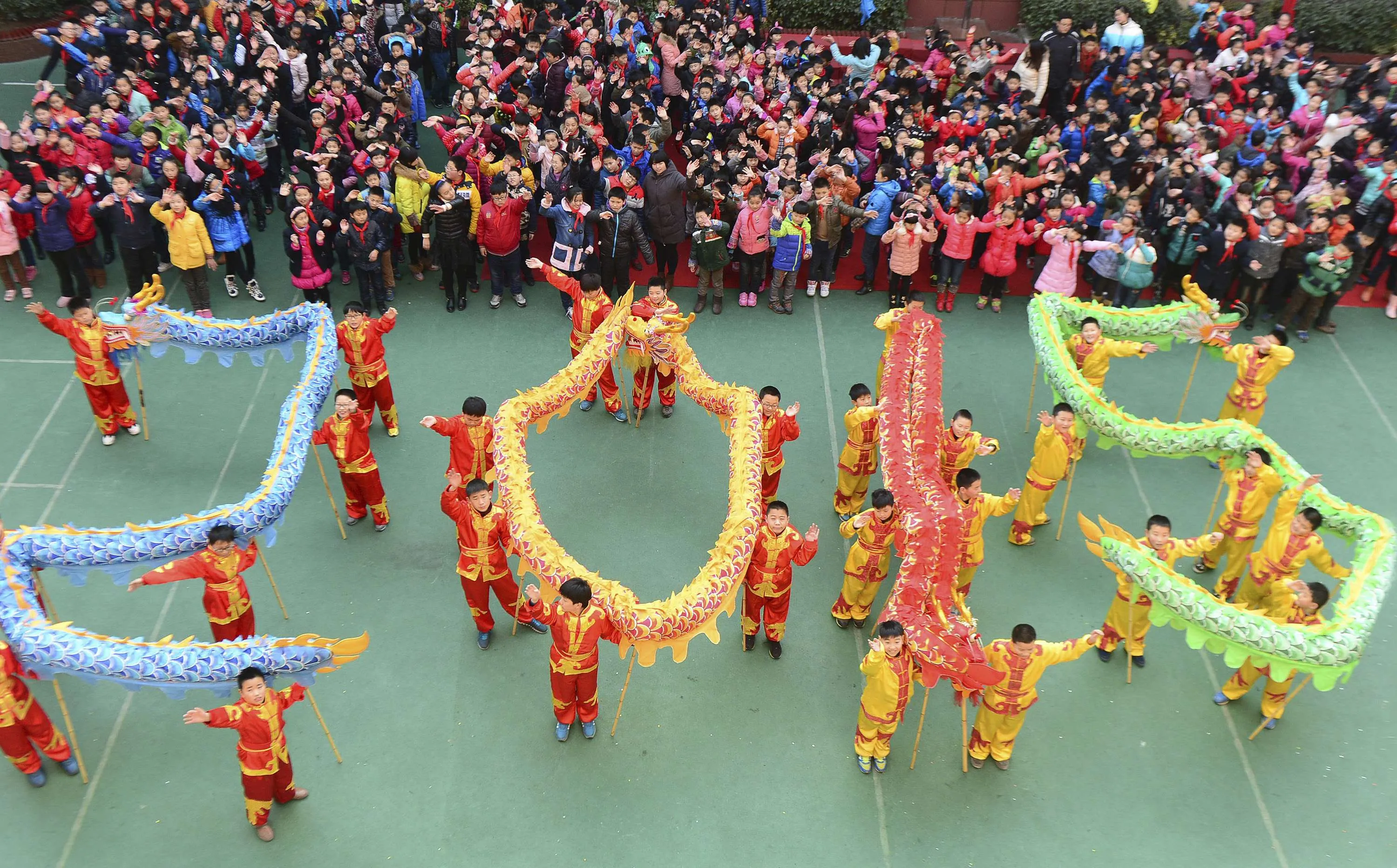 Students with dragon dance props form “2015” to welcome the upcoming New Year at an art school in Hefei, Anhui province, December 31, 2014. (Photo by Reuters/Stringer)