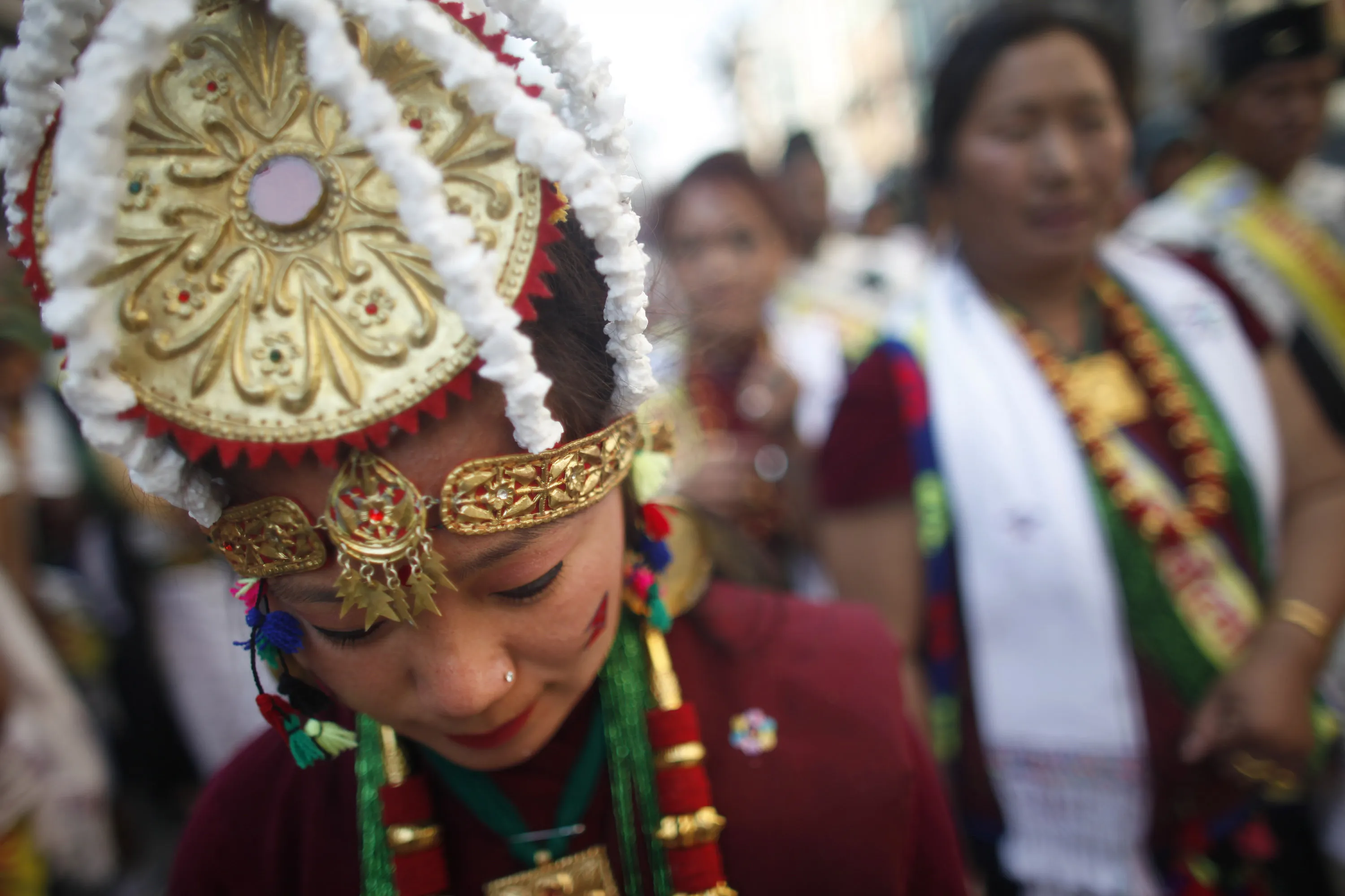 A Nepalese Gurung community woman, wearing traditional attire, dances during a parade to mark their New Year know as “Tamu Loshar” in Katmandu, Nepal, Tuesday, December 30, 2014. The indigenous Gurungs, also known as Tamu, are celebrating their new year, welcoming the year of the Sheep. (Photo by Niranjan Shrestha/AP Photo)