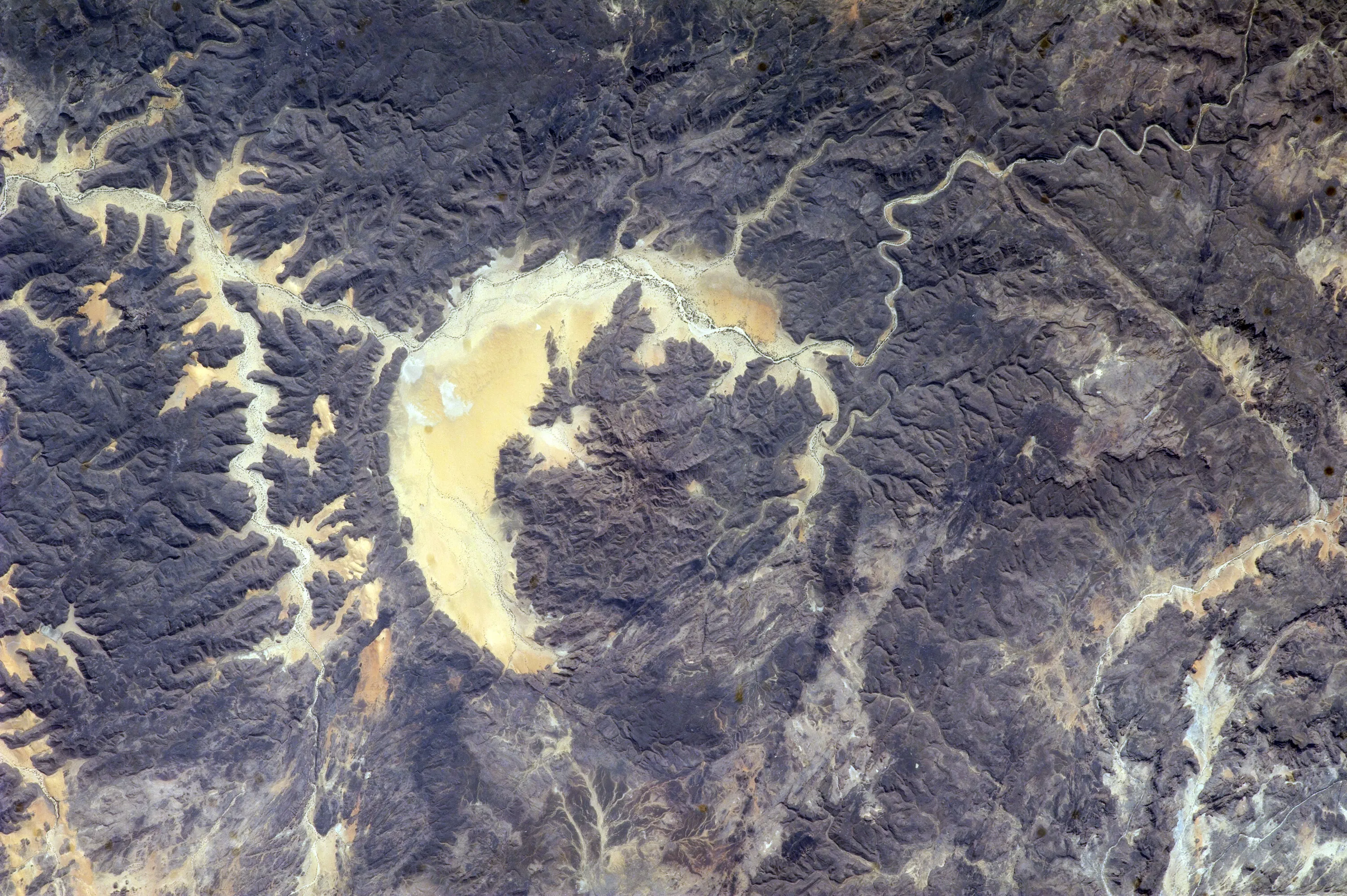 A photograph of The Gweni-Fada impact crater taken by astronauts on board the International Space Station on April 01, 2014 in Chad. Gweni-Fada measures 14 kilometres in diameter and formed around 360 million years ago on April 1, 2014 at Gweni-Fada, Chad. (Photo by NASA/SPL/Barcroft Media)