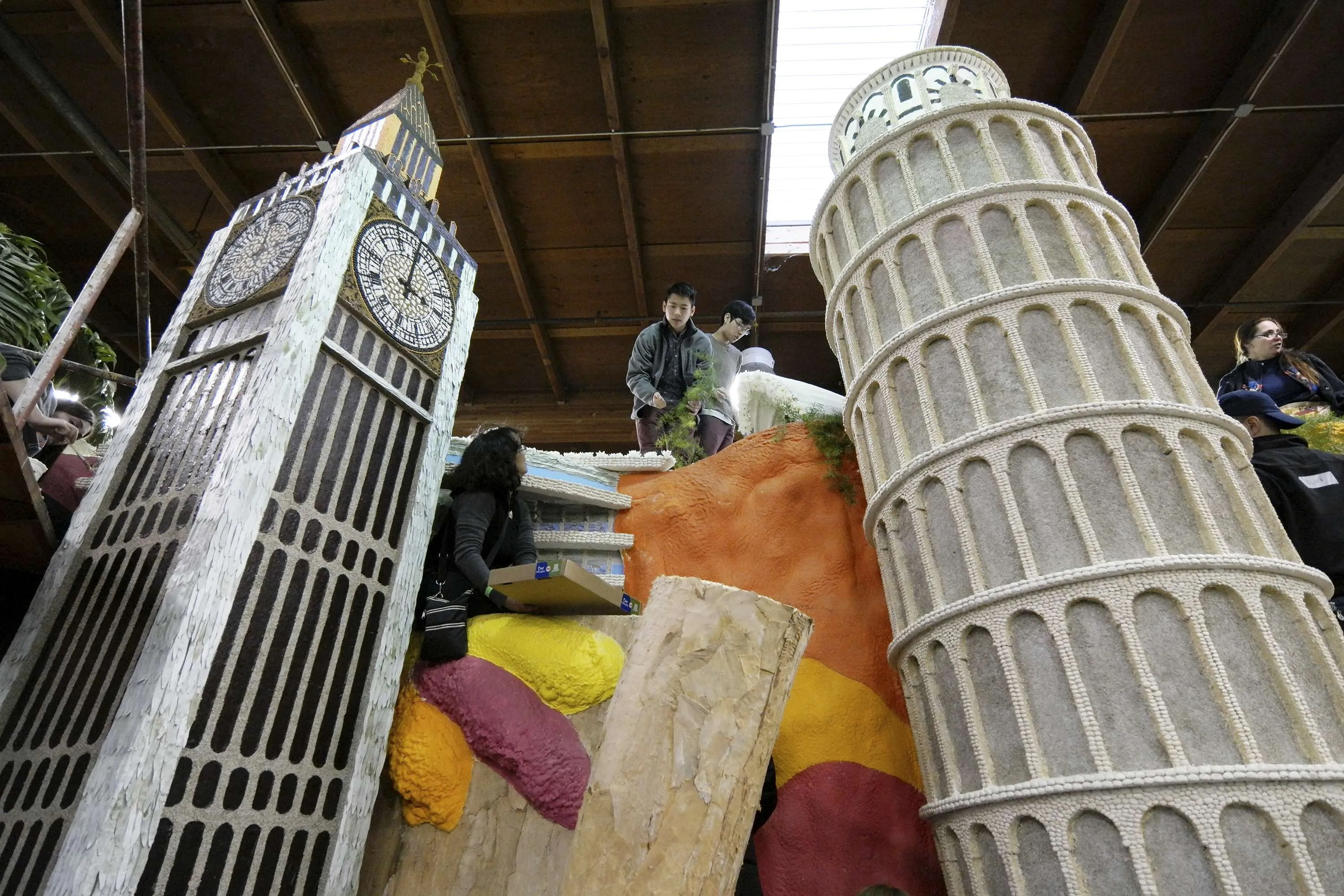 Volunteers work on Princess Cruises' Rose Parade float which includes models of Big Ben and the Leaning Tower of Pisa in Pasadena, California December 30, 2014. (Photo by Jonathan Alcorn/Reuters)